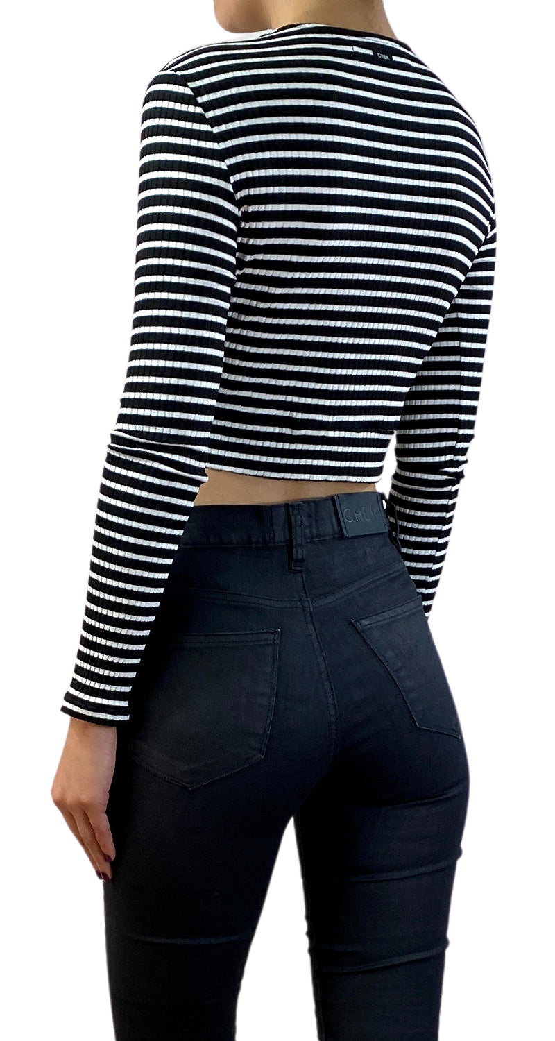 Top de rayas manga larga color Negro y Blanco con abertura en delantero, Talla 2 de la marca.