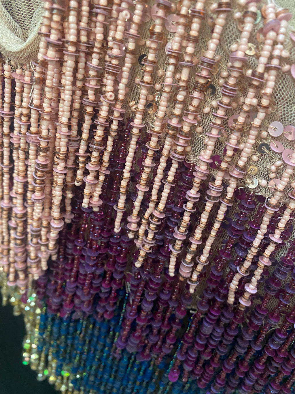 Top sin mangas con diseño de lentejuelas y mostacillas colgando.