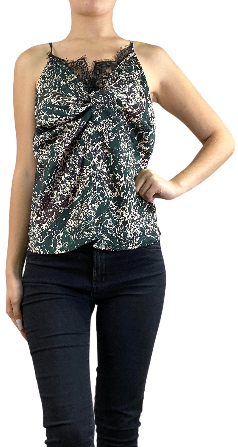 Top color Verde sin mangas con diseño de encaje y detalle drapeado en delantero.