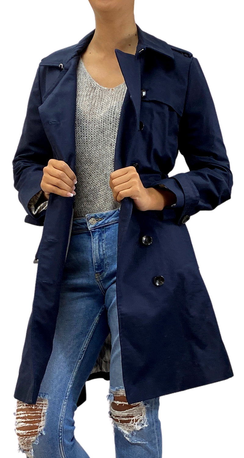 Trench color Azul Marino con doble botonadura y cinturón, con forro de líneas en tonos Blanco, Celeste y Amarillo.
