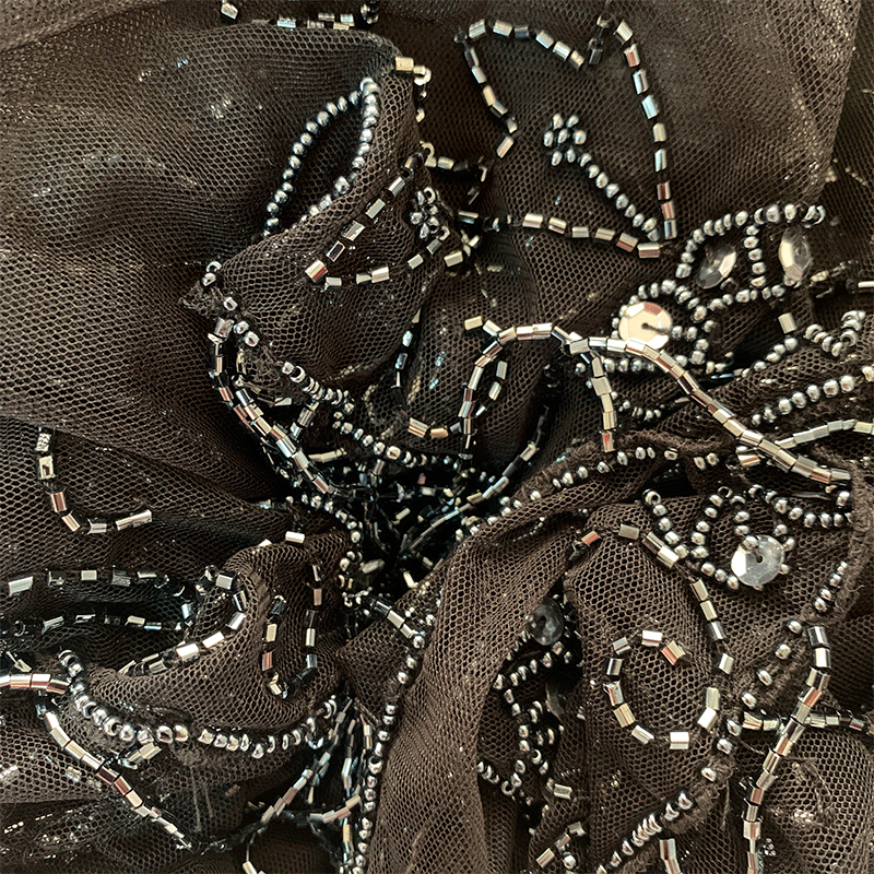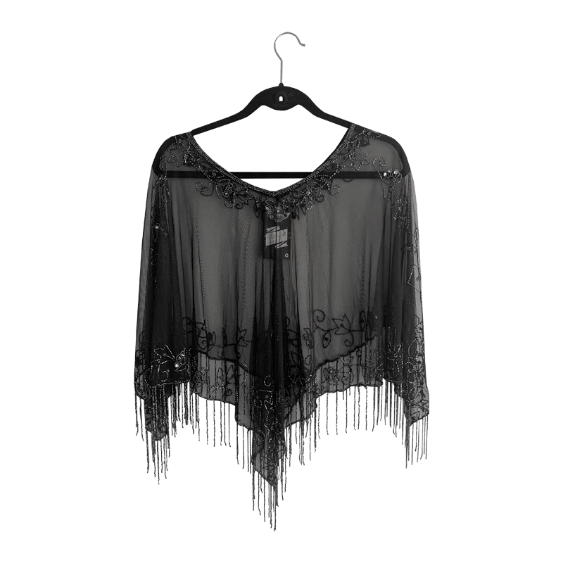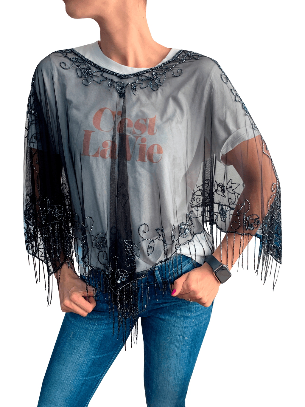 Tapado estilo poncho de tul bordado con aplicaciones y flecos de mostacillas.