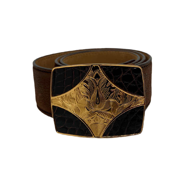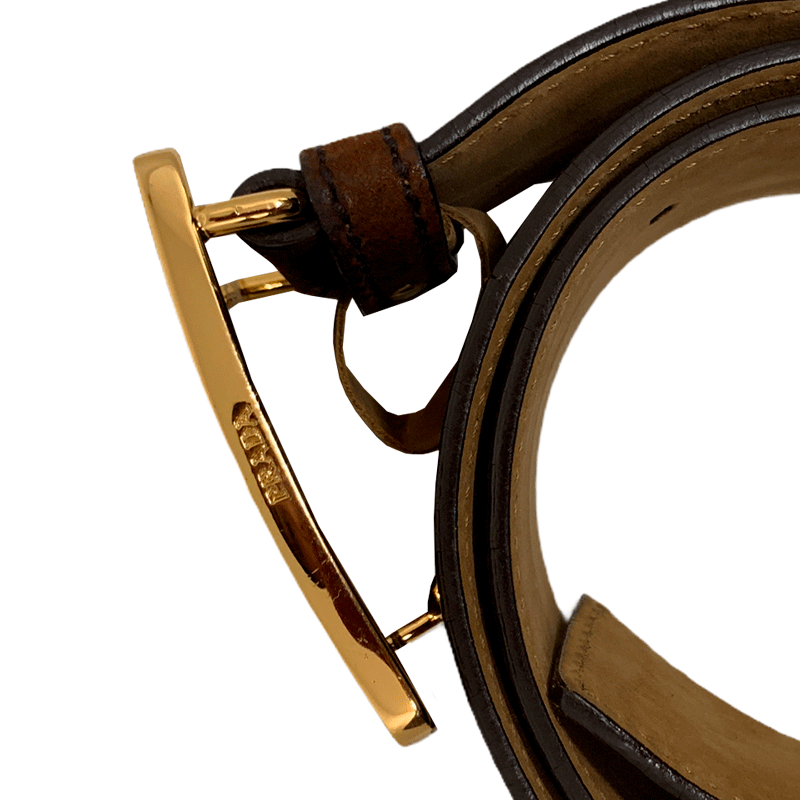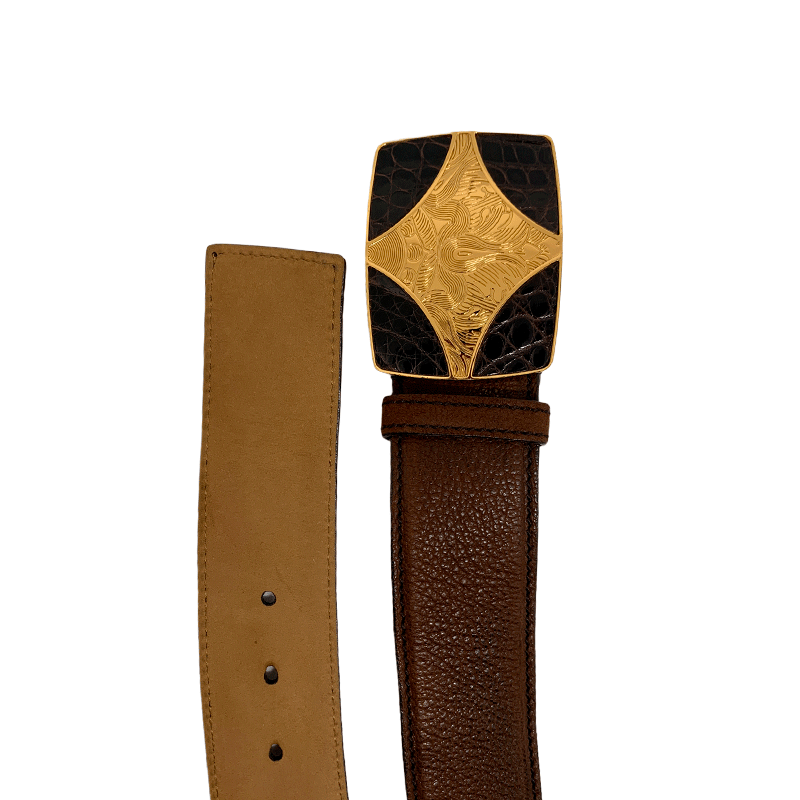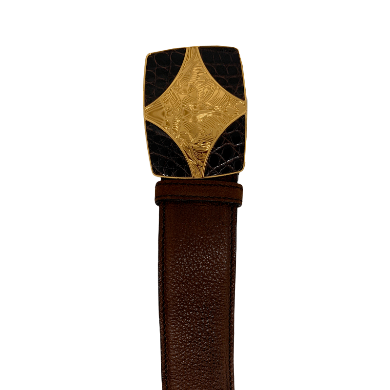 Cinturón Café de cuero texturizada con hebilla de metal texturizado en tonos dorados y craquelado en Café. Largo: 78 Cm (Ultimo orificio de ajuste)