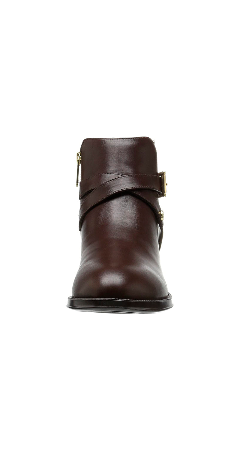 Botin de cuerina Café Oscuro con cinturon cruzado decorativo.