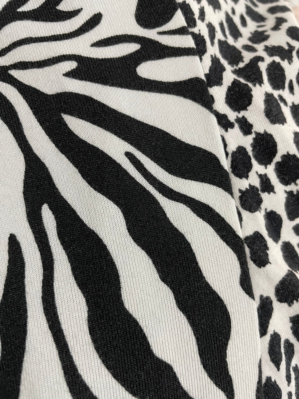 Vestido con estampado mix de Animal Print en color Blanco y Negro, vuelos en parte superior y ruedos, lazo en cintura. Altura de modelo 1,74 No especifica talla.