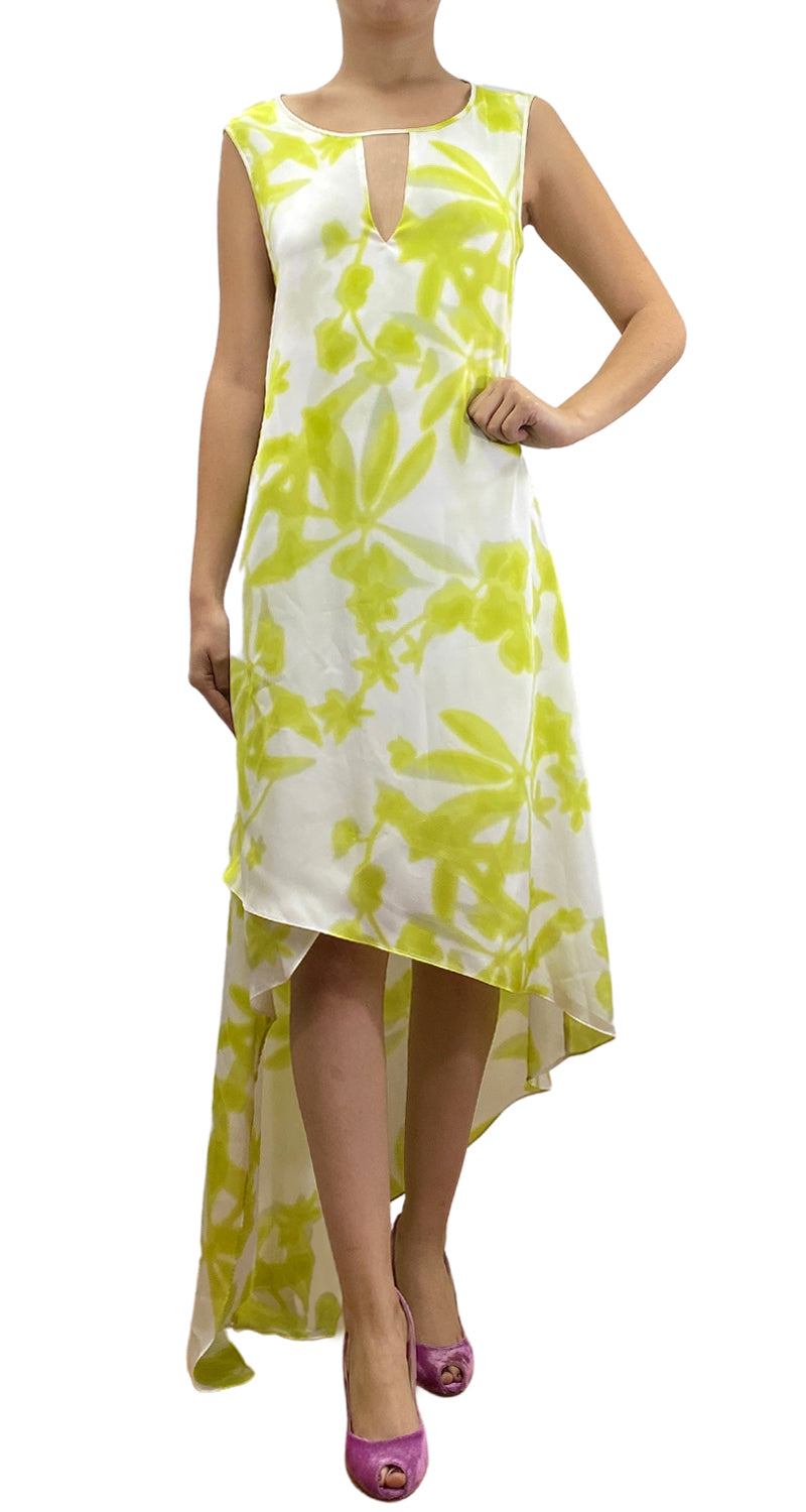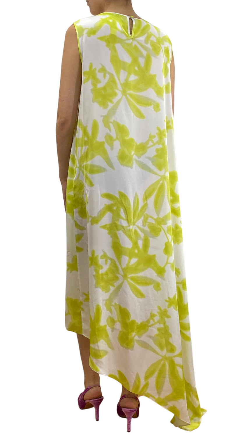 Vestido Midi con estampado en tonos Verde, de corte asimétrico en falda. Altura de modelo 1,68