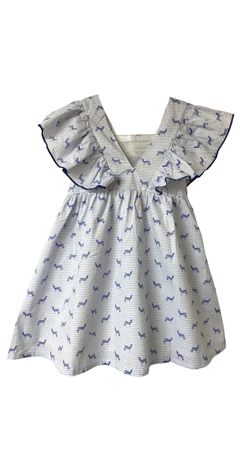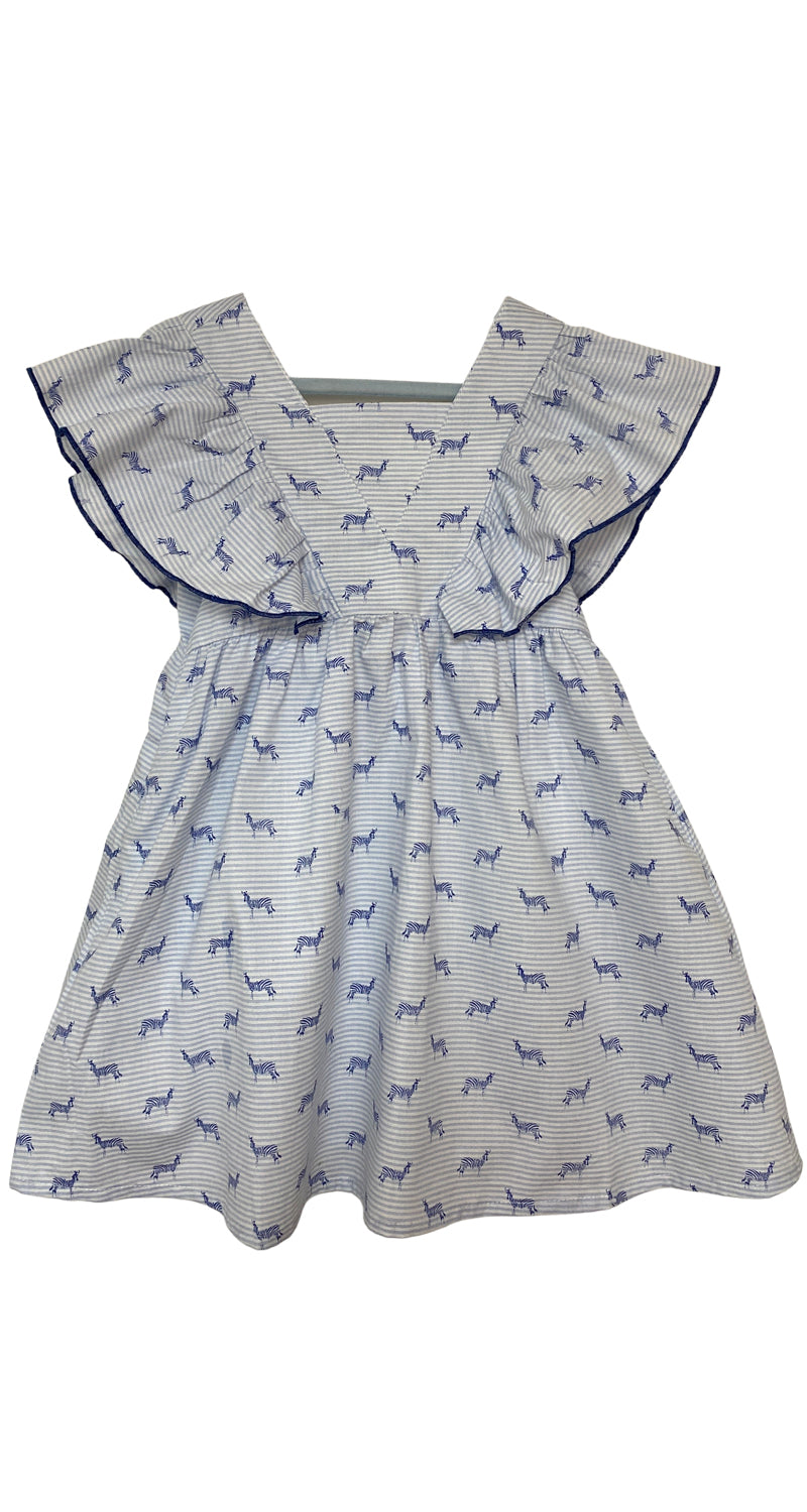 Vestido Azul a rayas con cebras. Cuello cuadrado por delante y en V por detrás, con volantes en hombros.