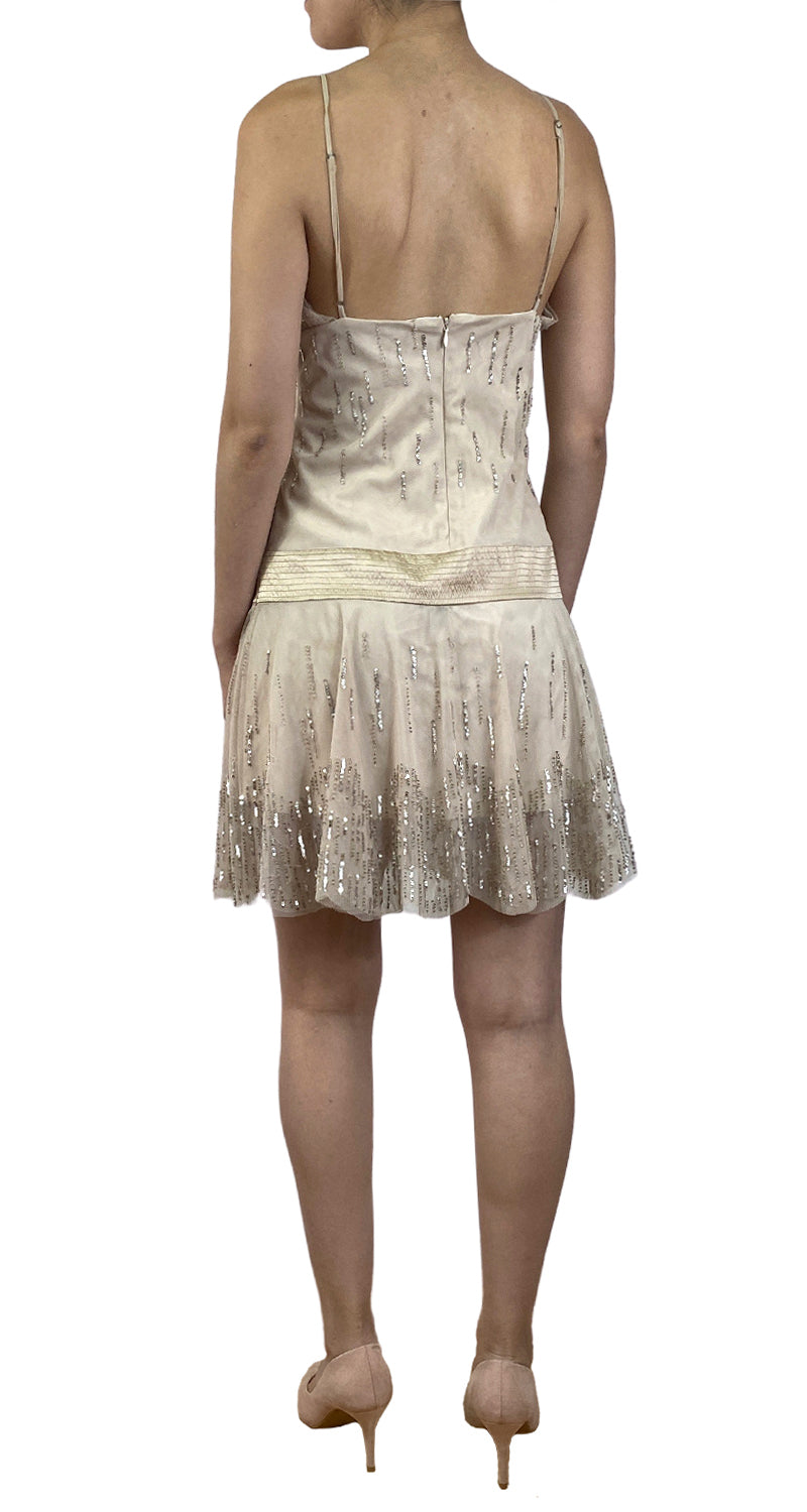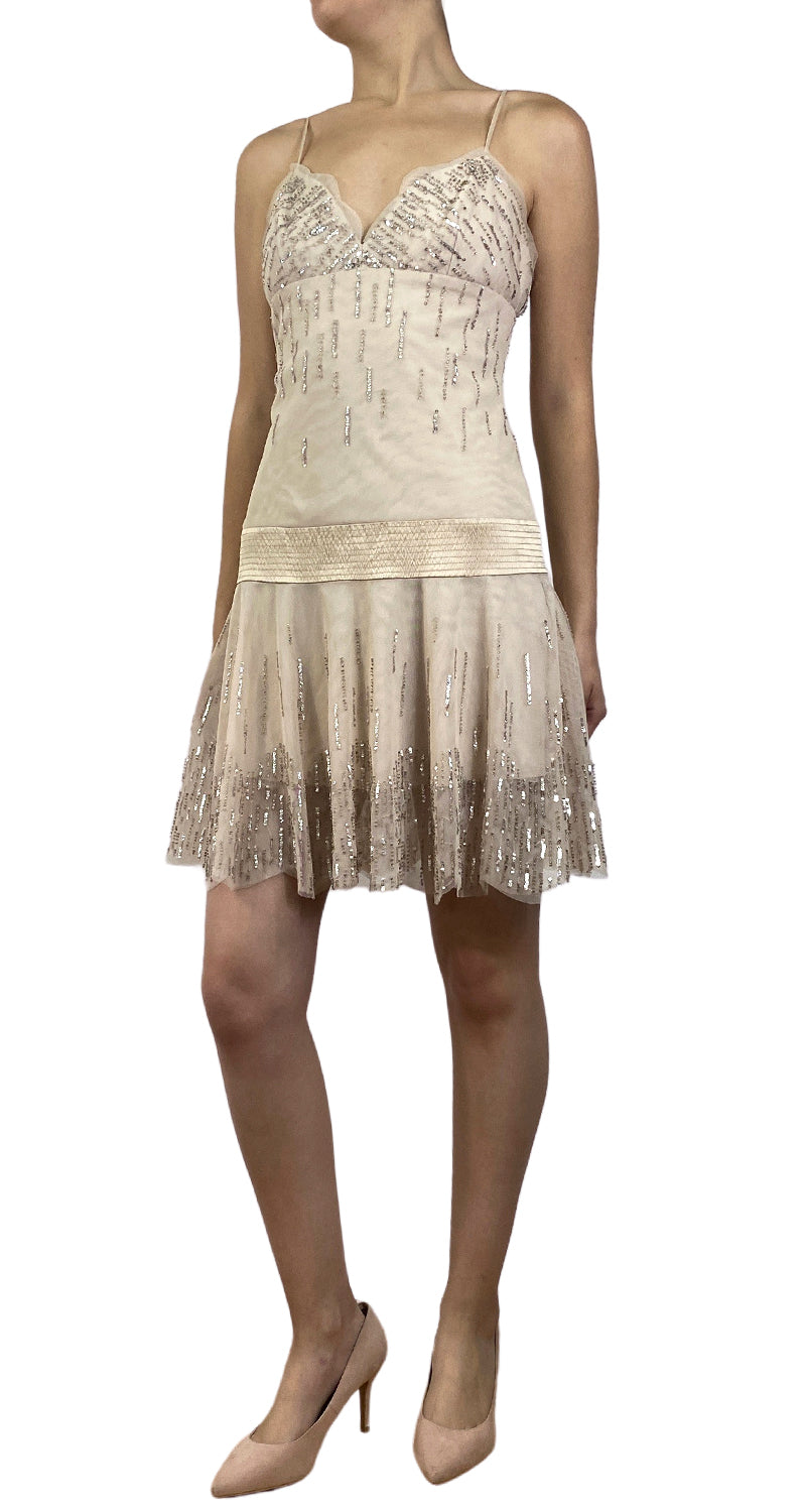 Vestido Beige de tirantes, con diseño de mostacillas decorativas. Altura modelo 1.68