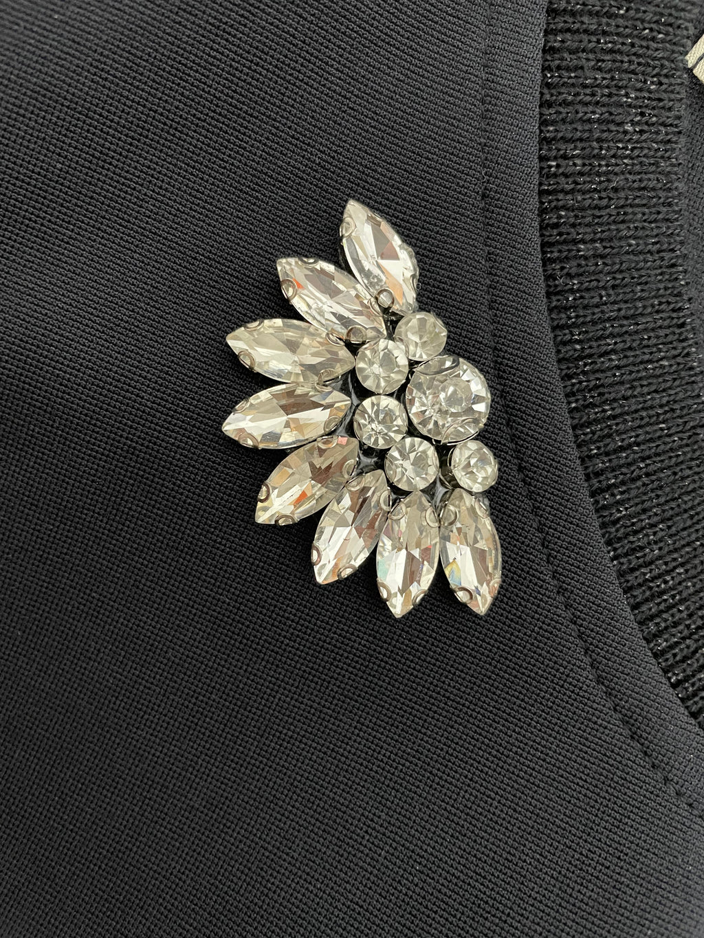 Vestido Negro con vuelos en hombros y aplicaciones de brillantes en delantero, cuello redondo con hilos metalizados. Talla 3 de la marca. Altura de modelo 1,68