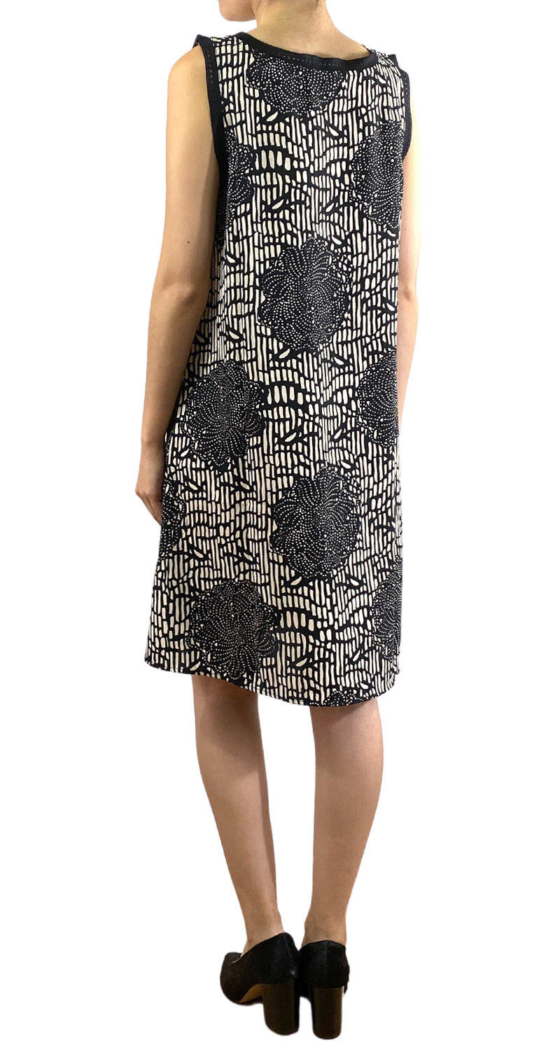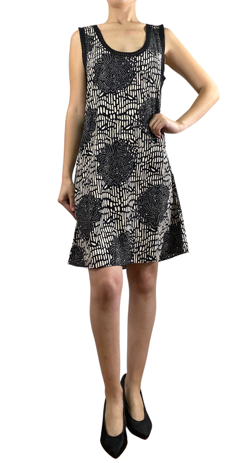 Vestido mini con estampado Beige y detalle Negro en ruedos. Altura modelo 1.68.