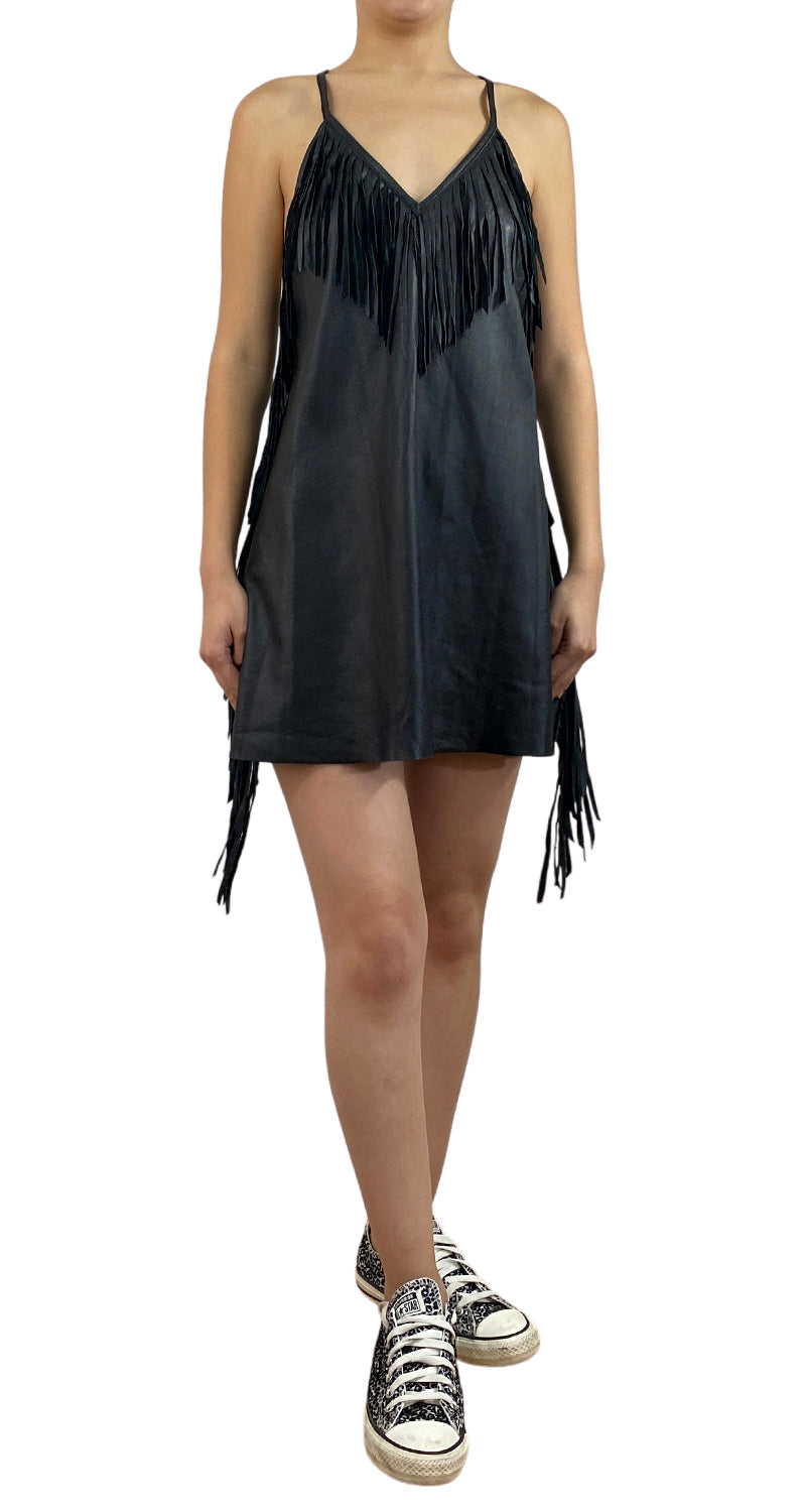 Vestido mini color Negro de cuero con diseño de flecos y escote en V frontal. Talla 42/2 de la marca.