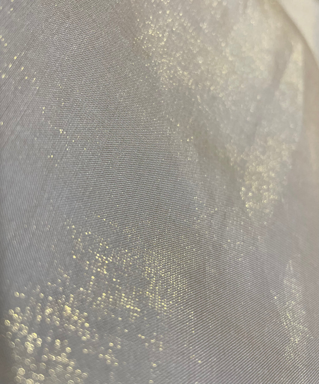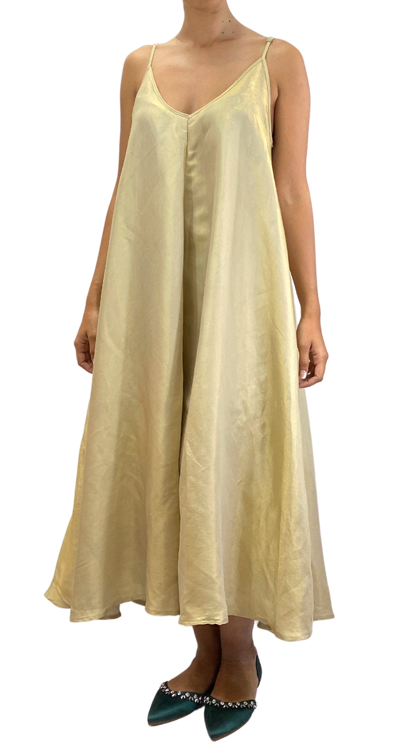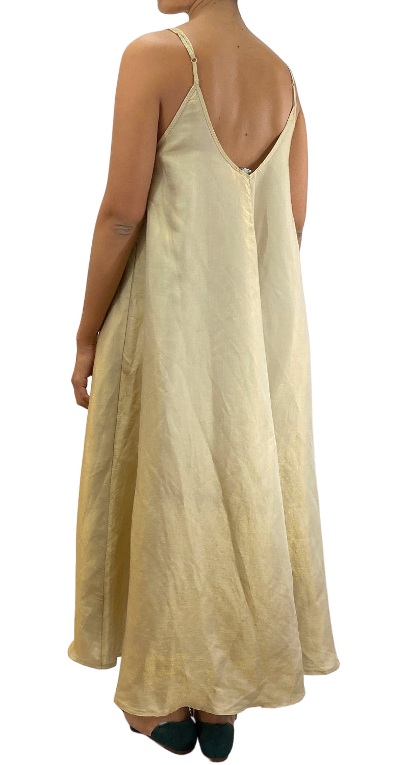 Vestido Midi color Dorado brillante y Beige Tornasol con escote en V y tirantes ajustables. Altura de modelo 1,76