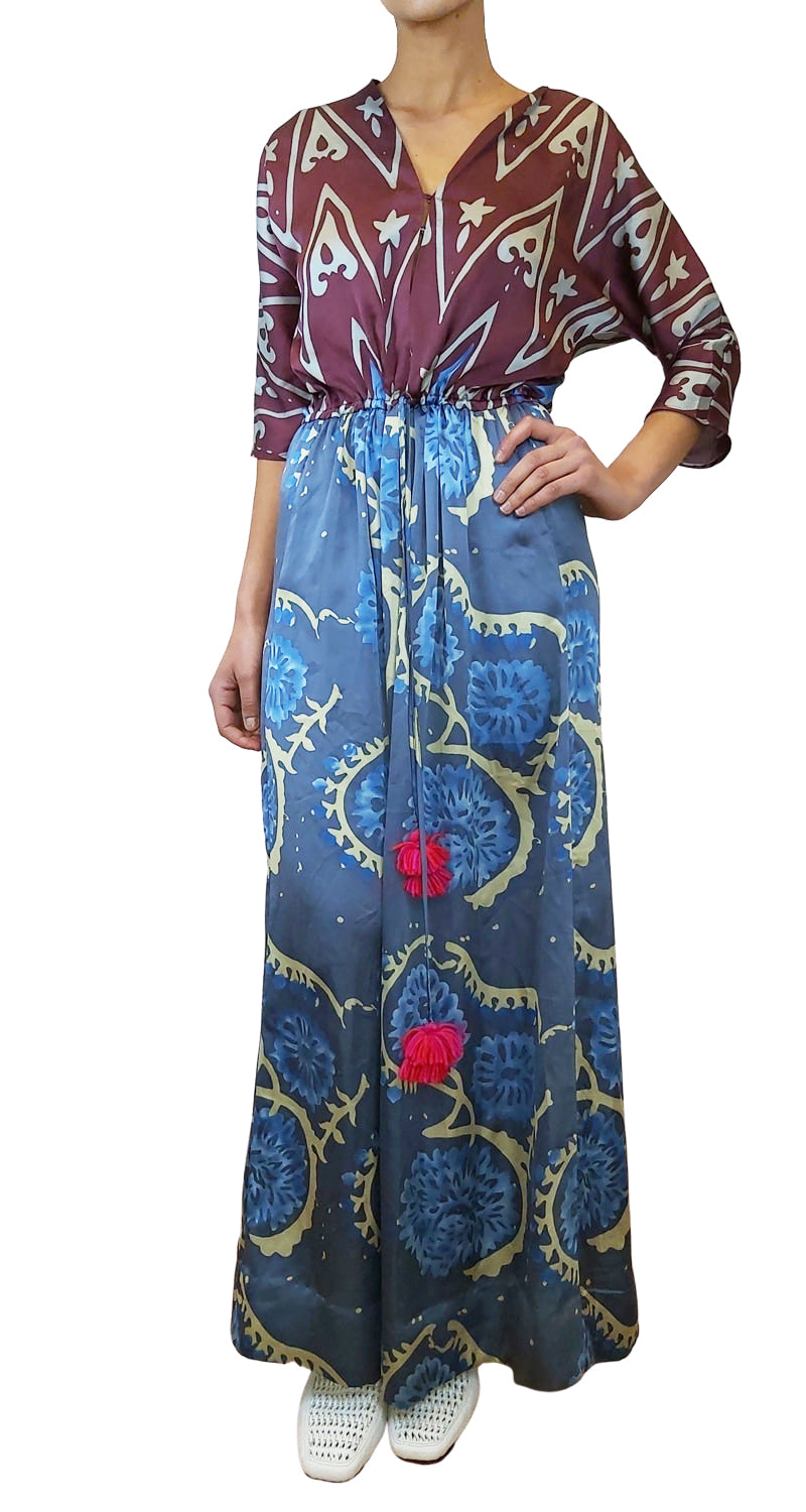 Vestido maxi con mangas 3/4 con diseño en color Violeta y Burdeo con lazo ajustable en cintura con borlas en Rojo y Fucsia.