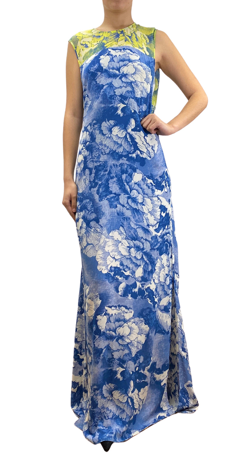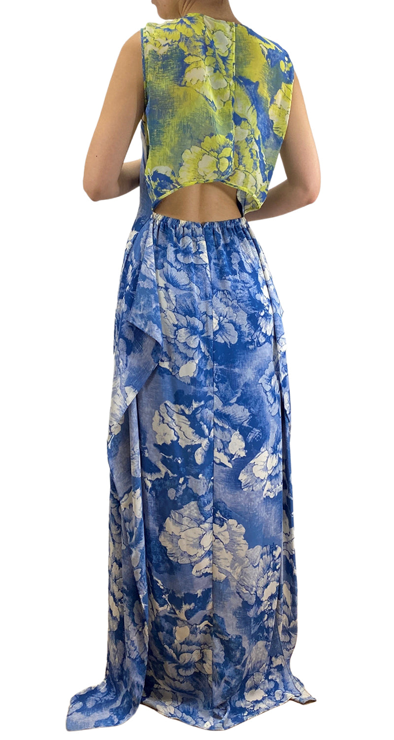 Vestido Maxi en color Azul y Amarillo con estampado de flores, escote en espalda y aberturas en laterales inferior. Altura de modelo 1,68