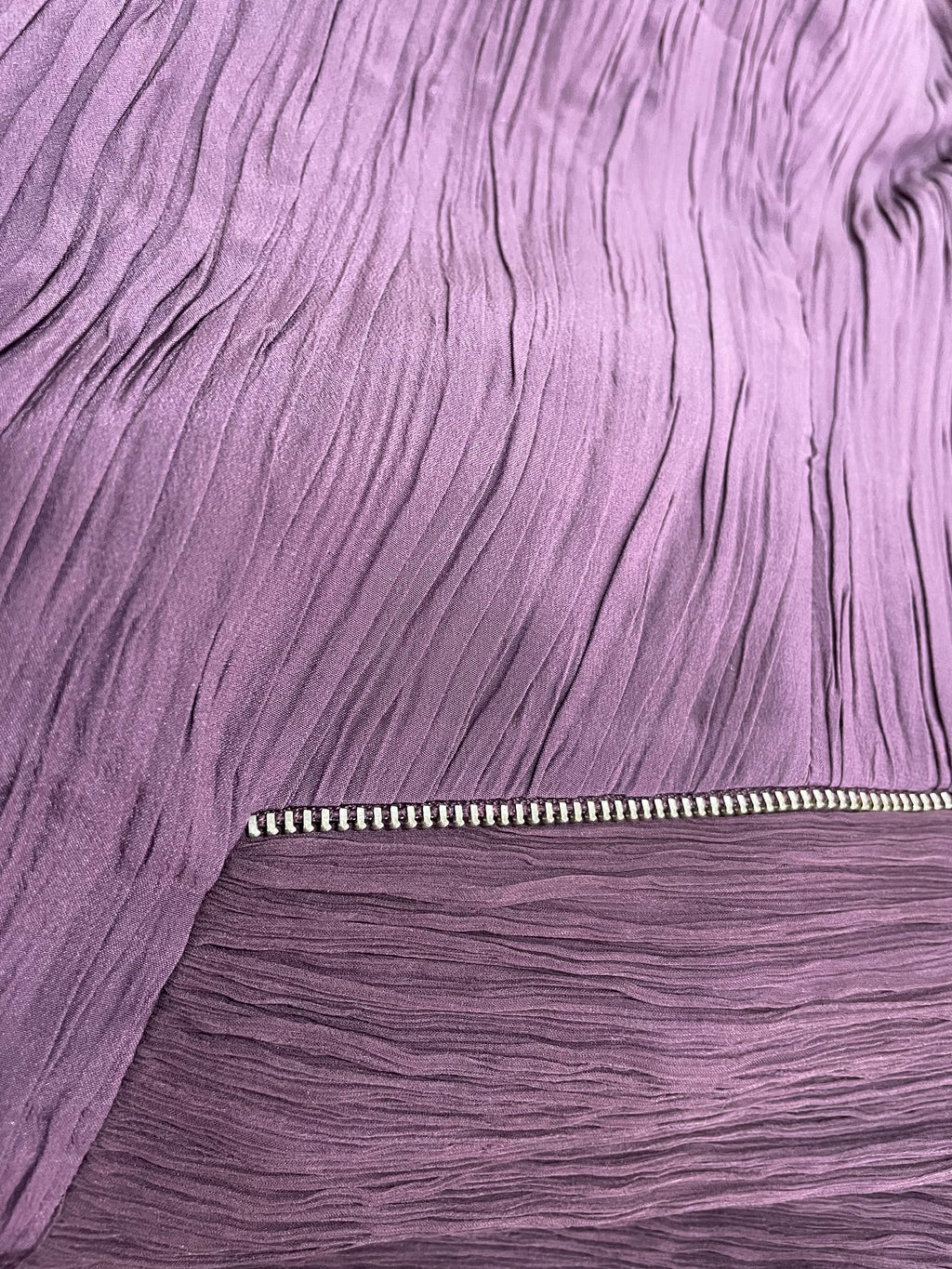 Vestido Mini en color Morado de diseño plisado y detalles de cierre en escote y cintura. Altura de modelo 1,76. Marca Carlos Miele