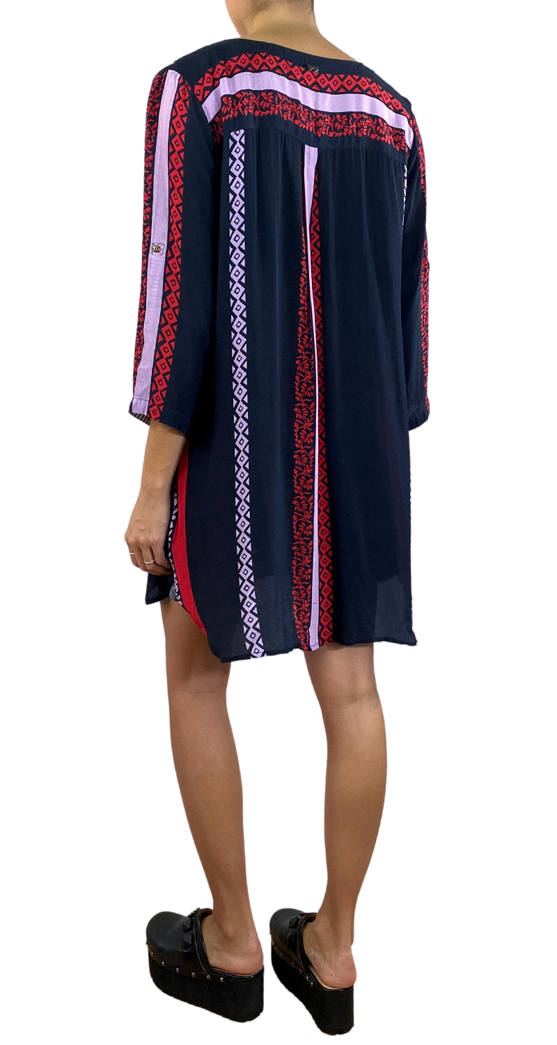Vestido estilo túnica color Azul con estampado Multicolor, botones en delantero, mangas 3/4 y bolsillos en laterales. Altura de modelo 1,71