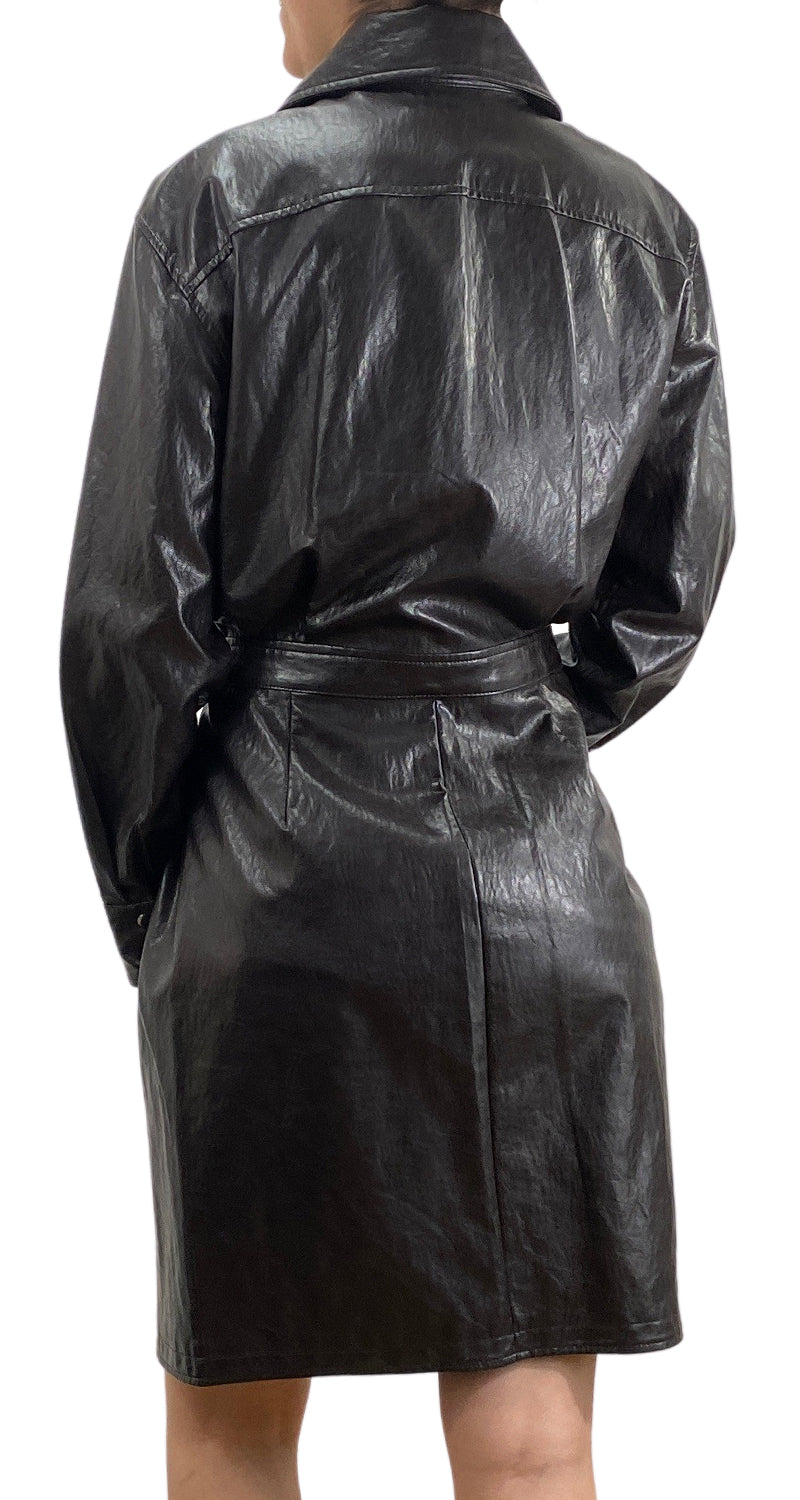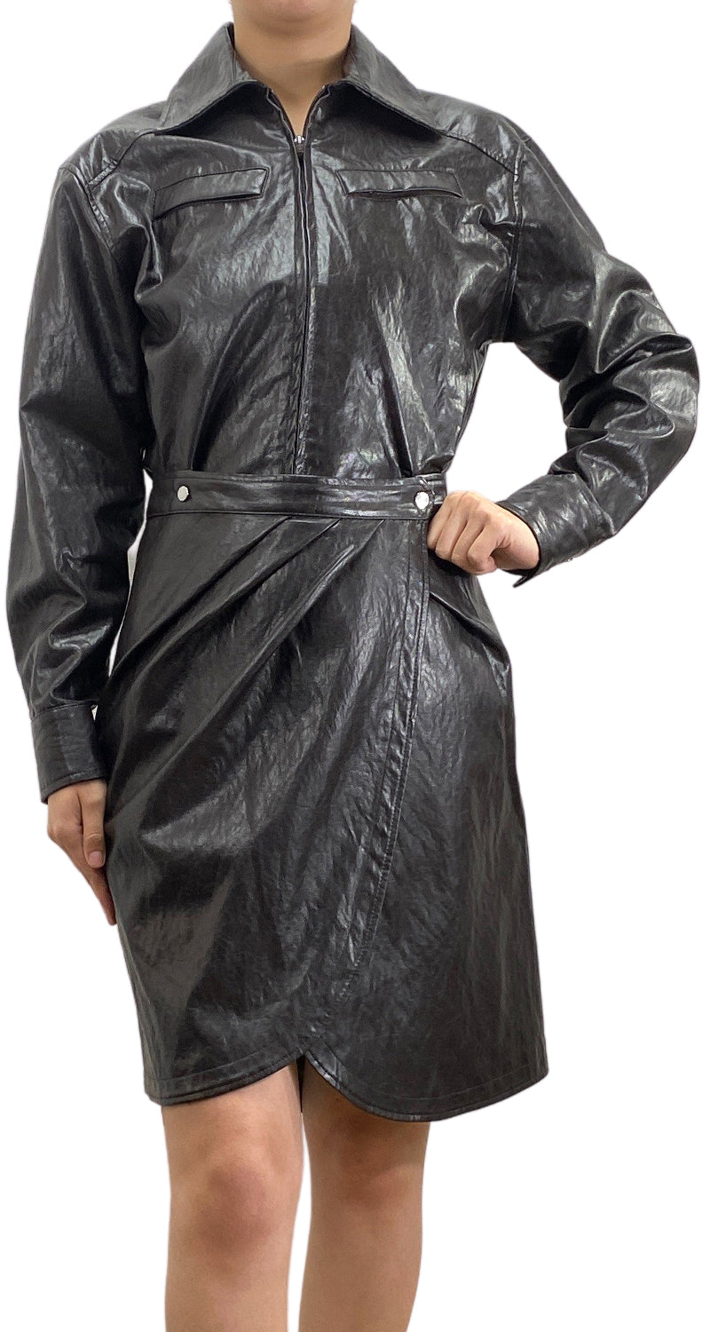 Vestido Mini de Ecocuero color Negro, dos bolsillos y cierre frontal, falda de corte asimétrico con plises y broches. Talla 1 de la marca. Altura de modelo 1,68.