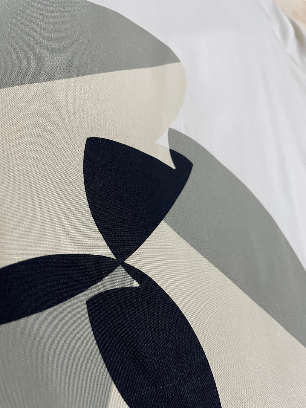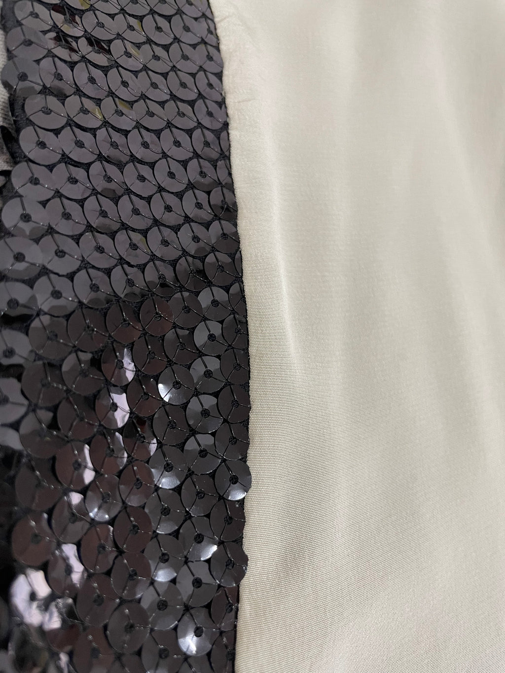 Vestido Mini de algodón en espalda y seda en delantero, mangas con lentejuelas Negras y estampado frontal. Altura de modelo 1,76