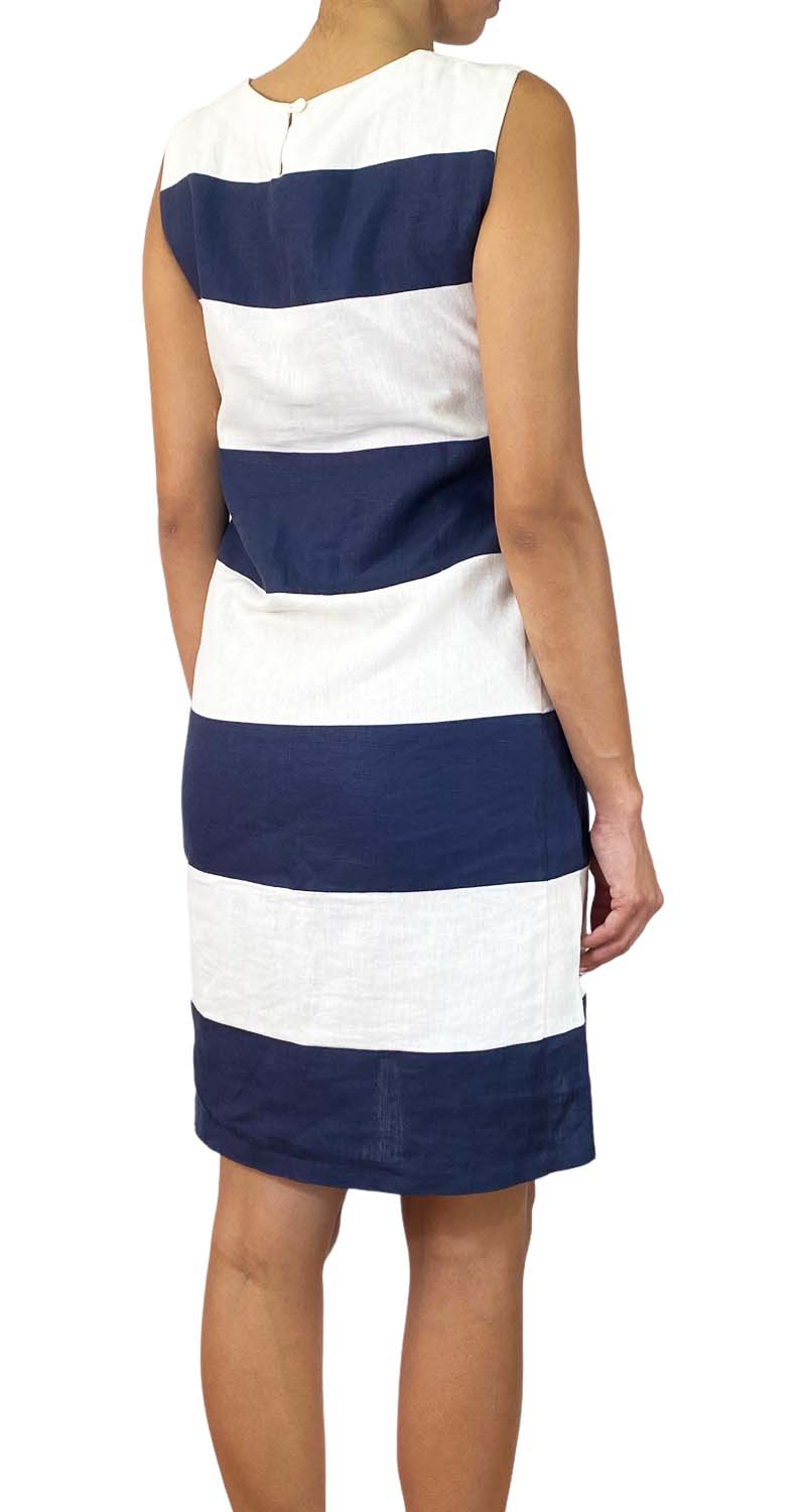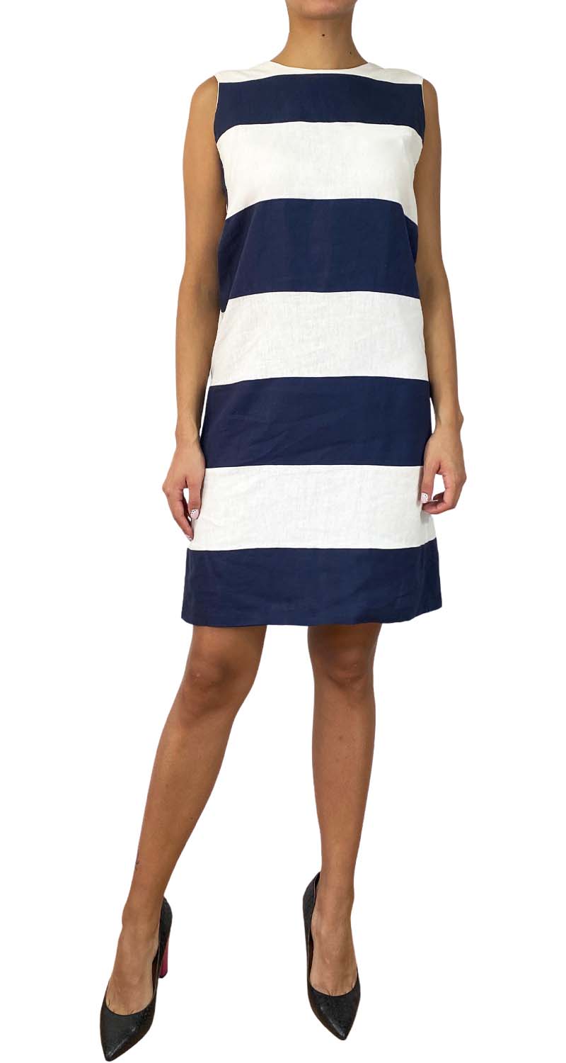 Vestido de Lino a rayas en tonos Navy y Beige. Sin mangas y escote redondo. Corresponde a la antigua marca Candie´s. Tiene pequeña mancha en etiqueta que desaparece con lavado.