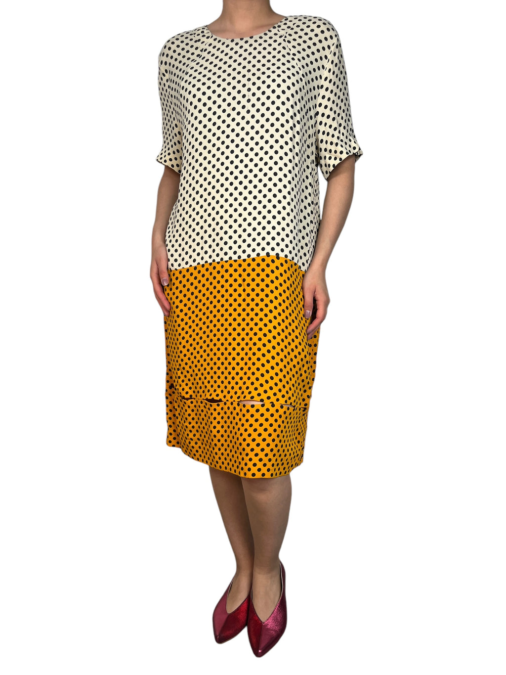 Presenta hilos corridos y pequeñas manchas. Altura del modelo 1,60