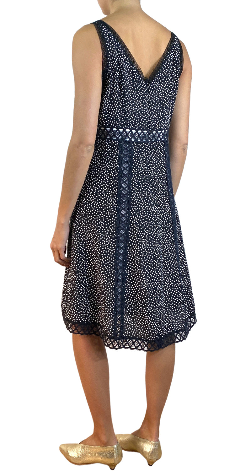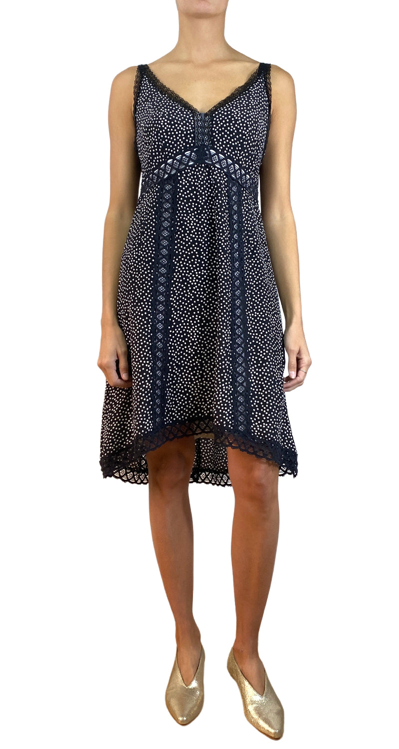 Vestido mini de Seda con estampado de lunares y detalle de encajes. Talla 10n us. Altura modelo 1.71.