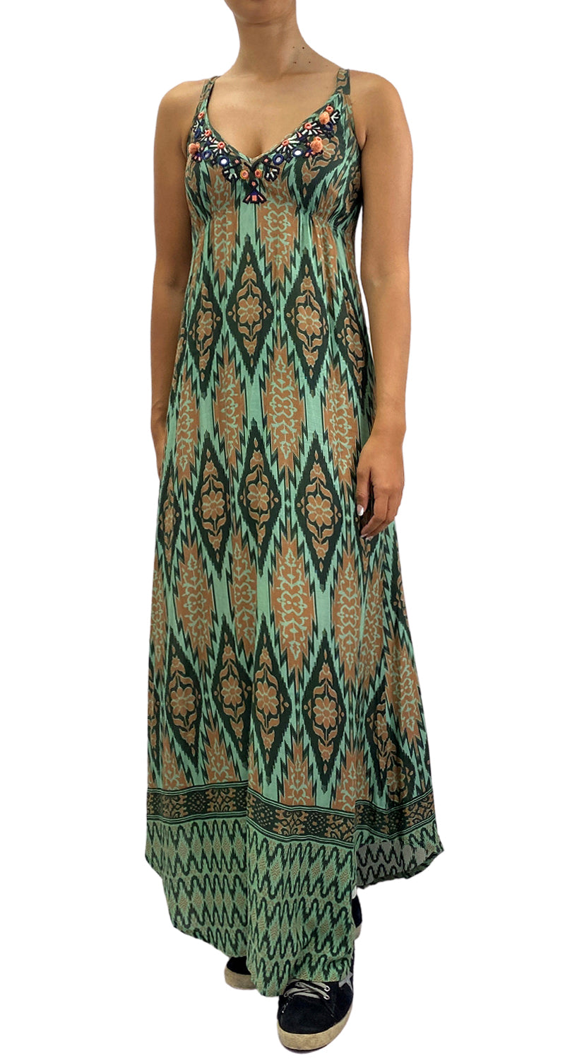 Vestido Maxi color Verde con estampado, bordado frontal multicolor y detalles de espejitos. Altura modelo 1.68.