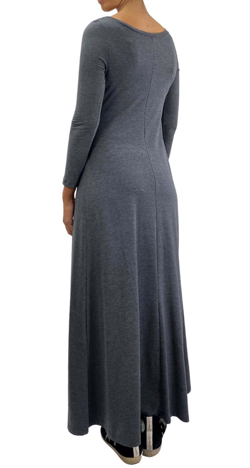 Vestido Maxi color Gris con cuello redondo y Manga Larga. Marca Corazón de Mar. Altura modelo 1.76.