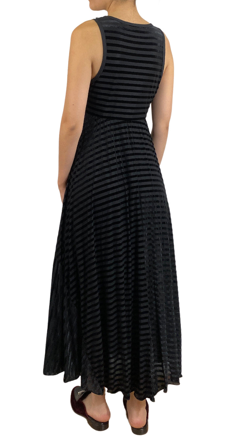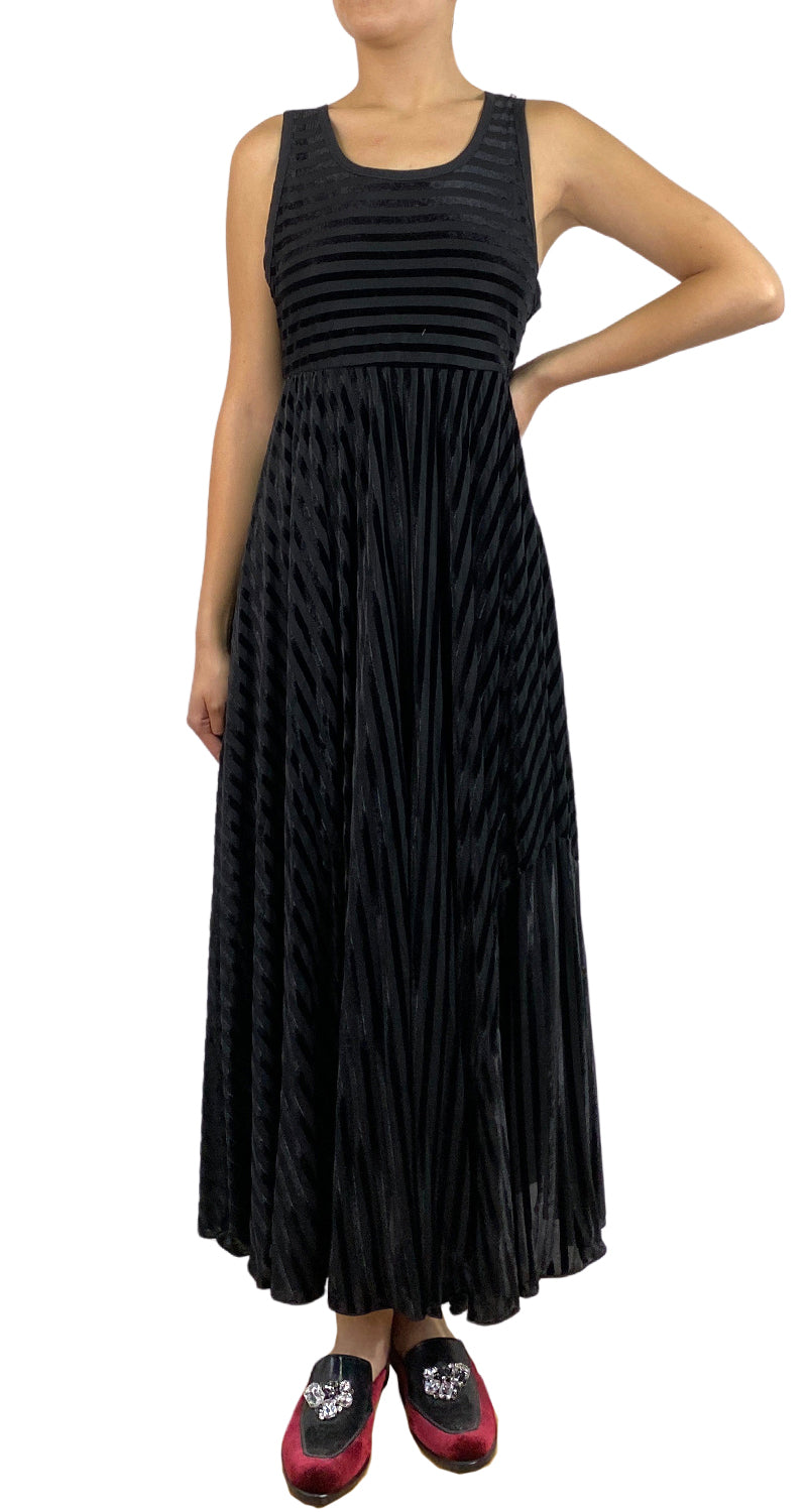 Vestido Maxi color Negro con diseño de rayas aterciopeladas. Altura modelo 1.68.