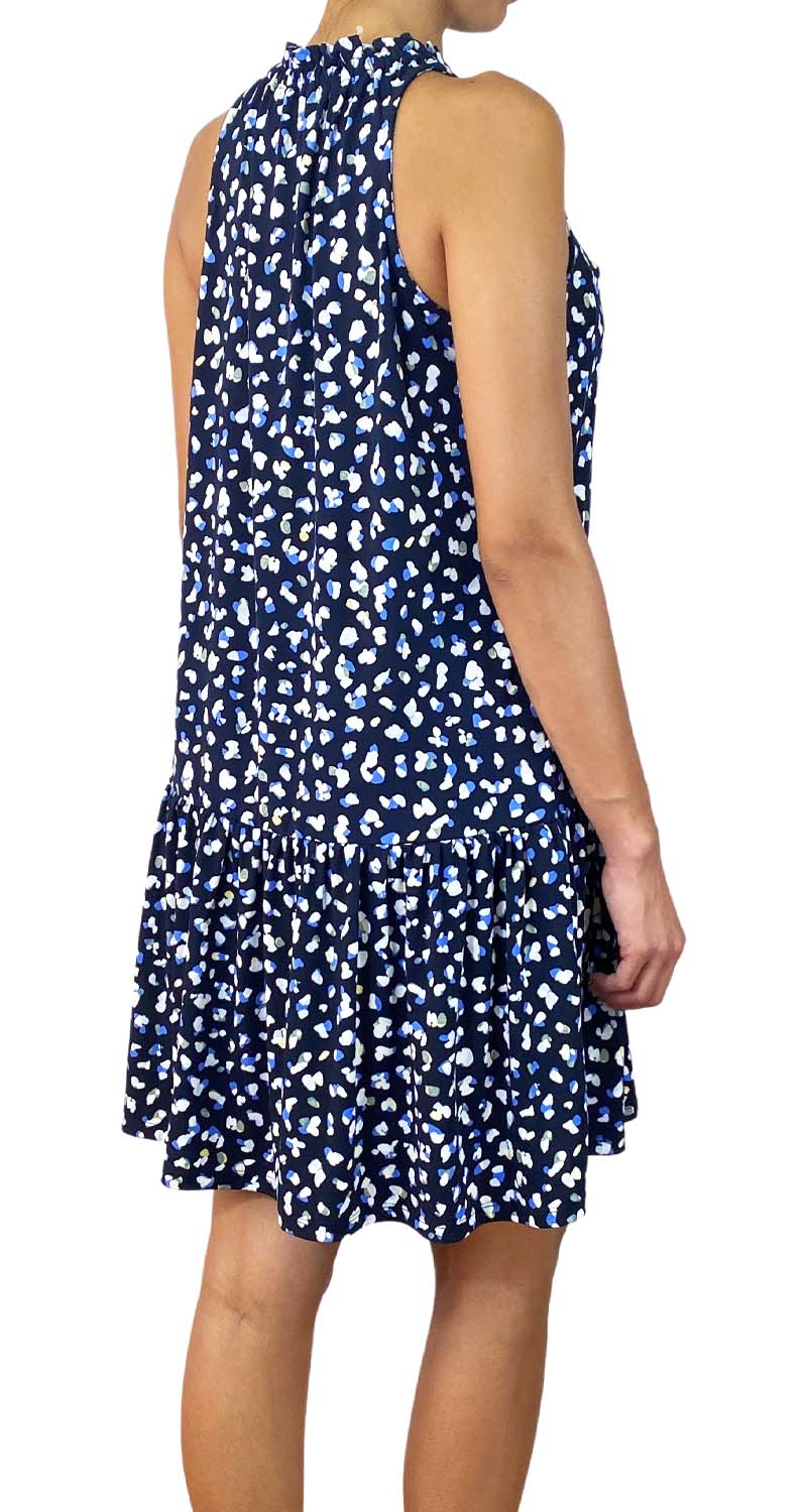 Vestido mini con estampado Animal Print en tonos Azules, sin mangas con escote redondo y volantes en ruedo.
