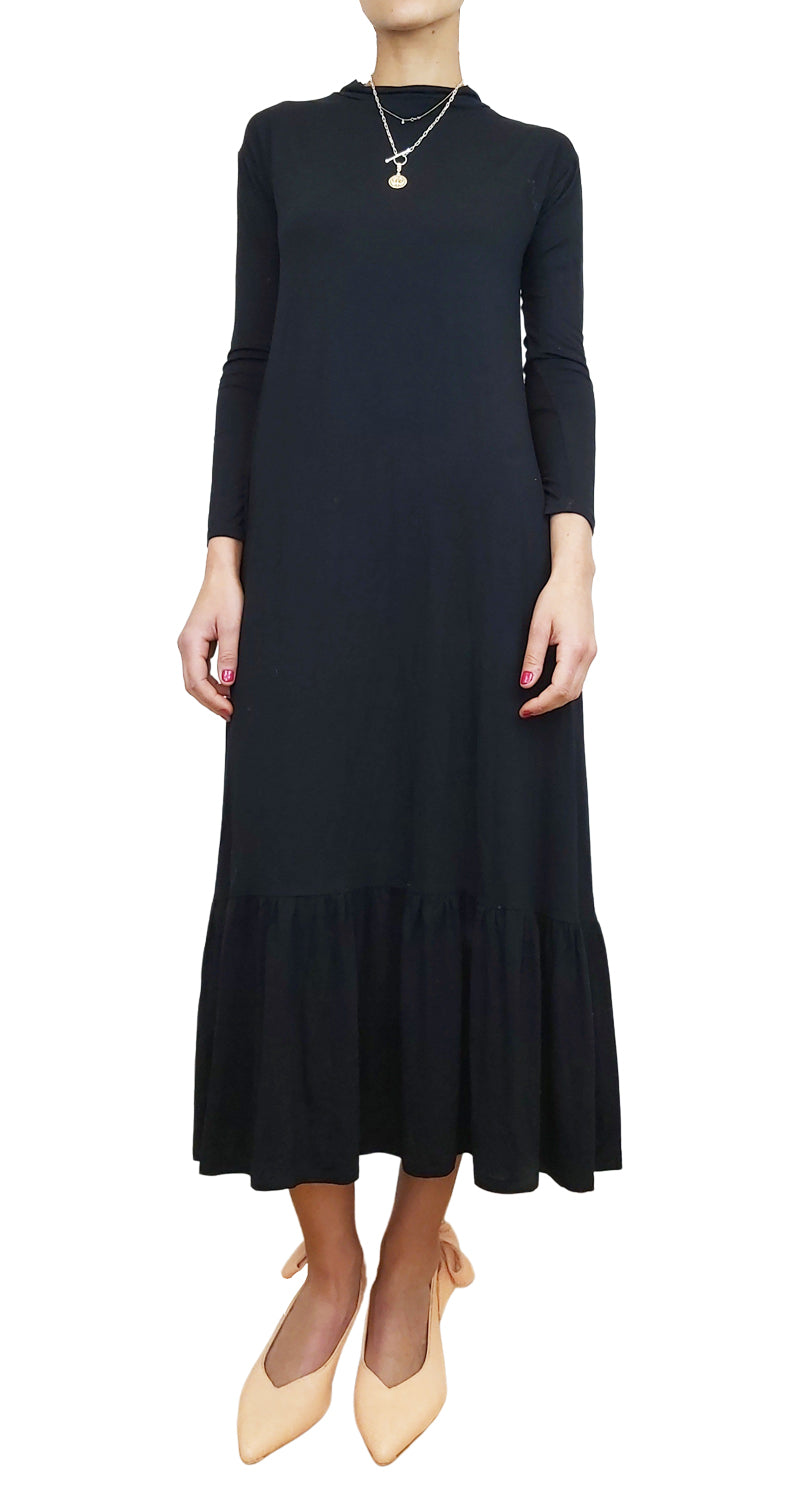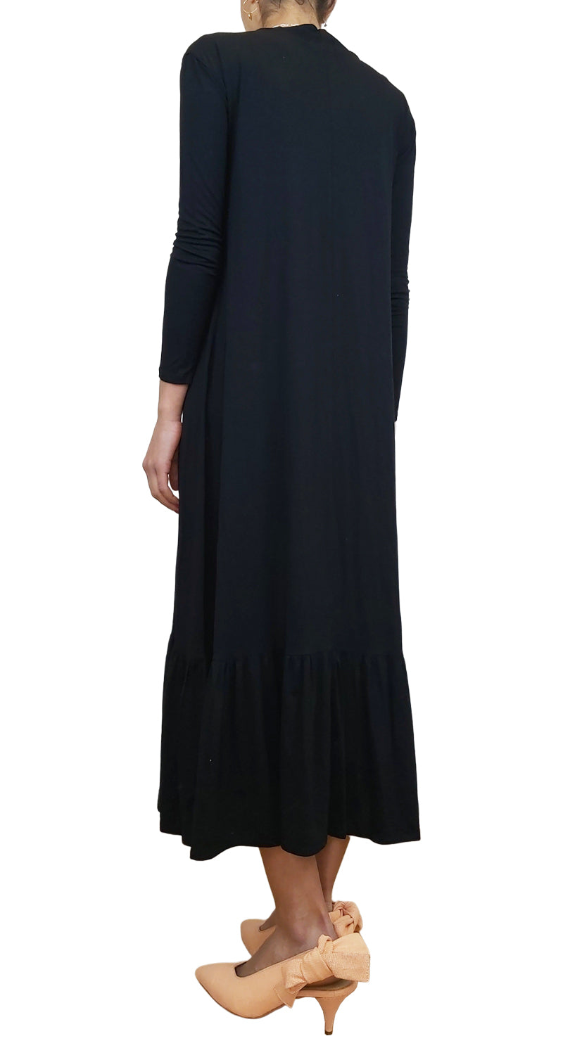 Vestido Maxi manga larga con cuello redondo y vuelos en ruedo. Altura modelo 1.78.