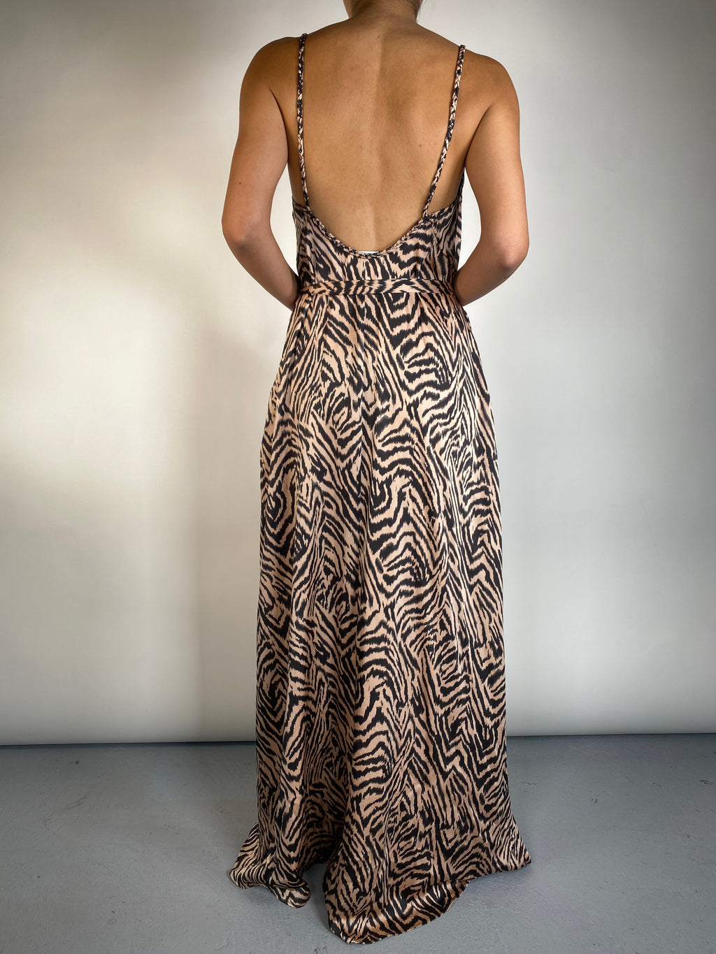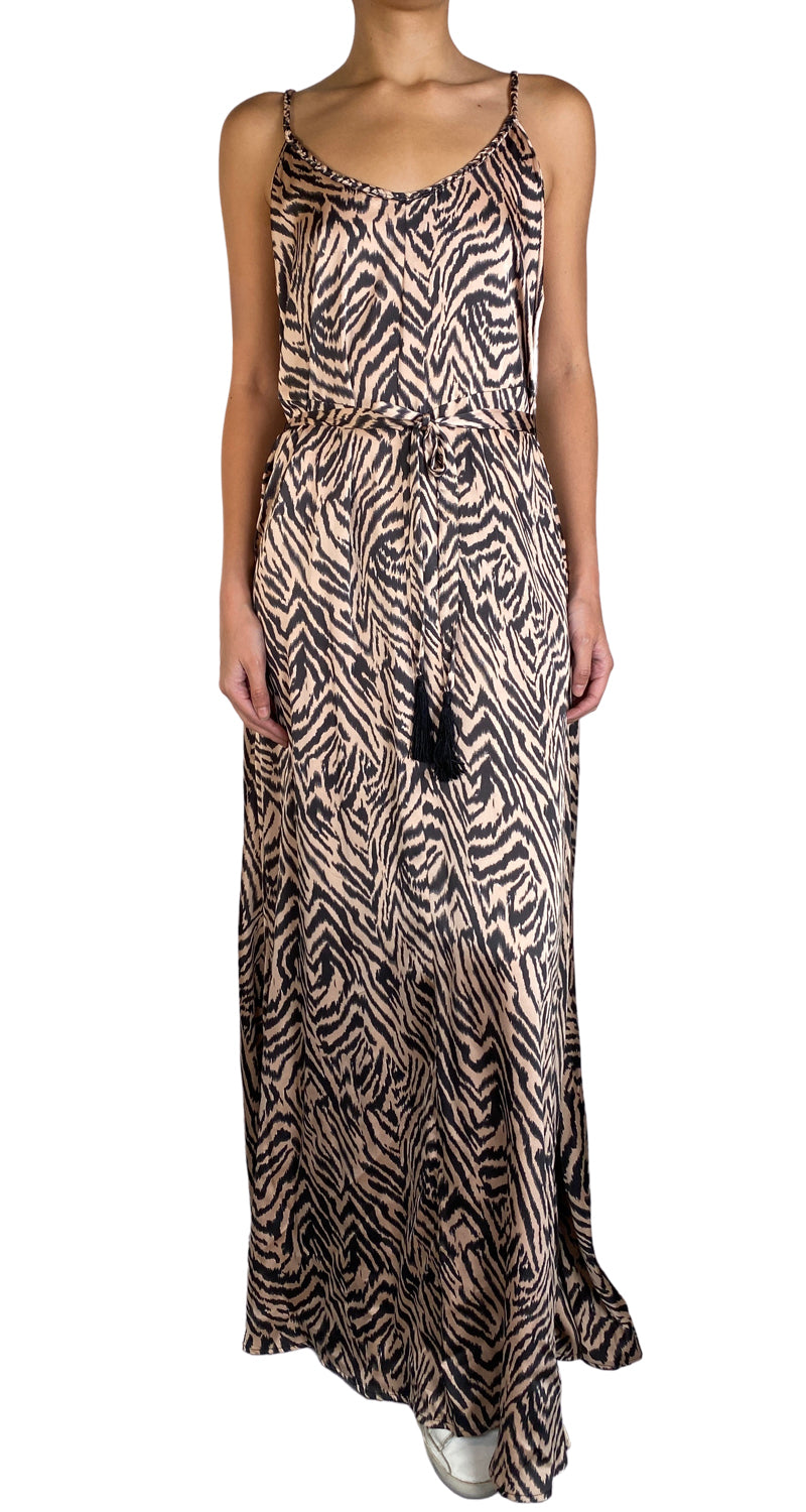 Vestido originalmente talla L, fue intervenido a una talla S/M. Altura de modelo 1,68