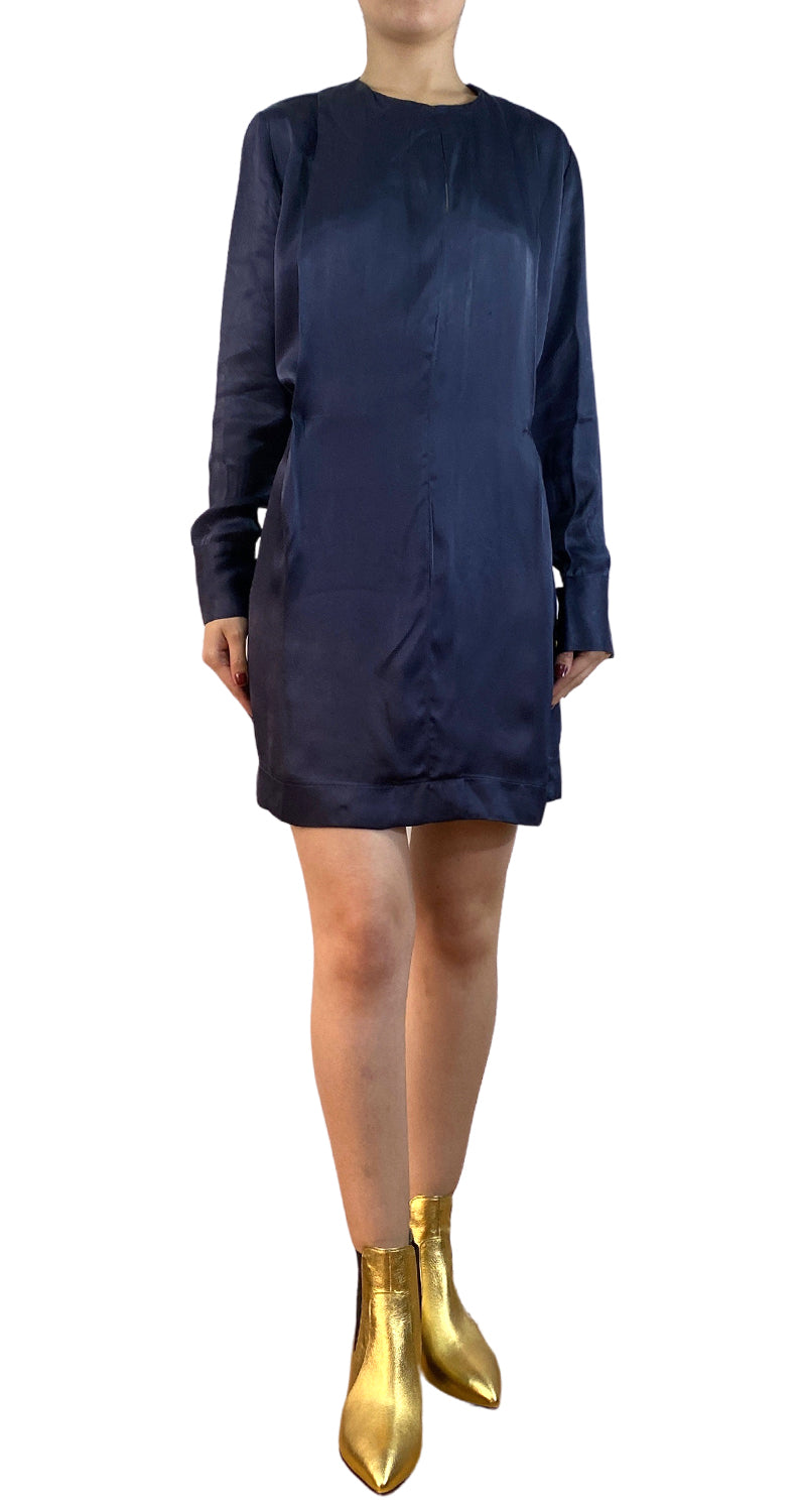 Vestido Azul, manga larga botones dorados y abertura en delantero superior. Talla 36 de la marca. Altura modelo 1.68.