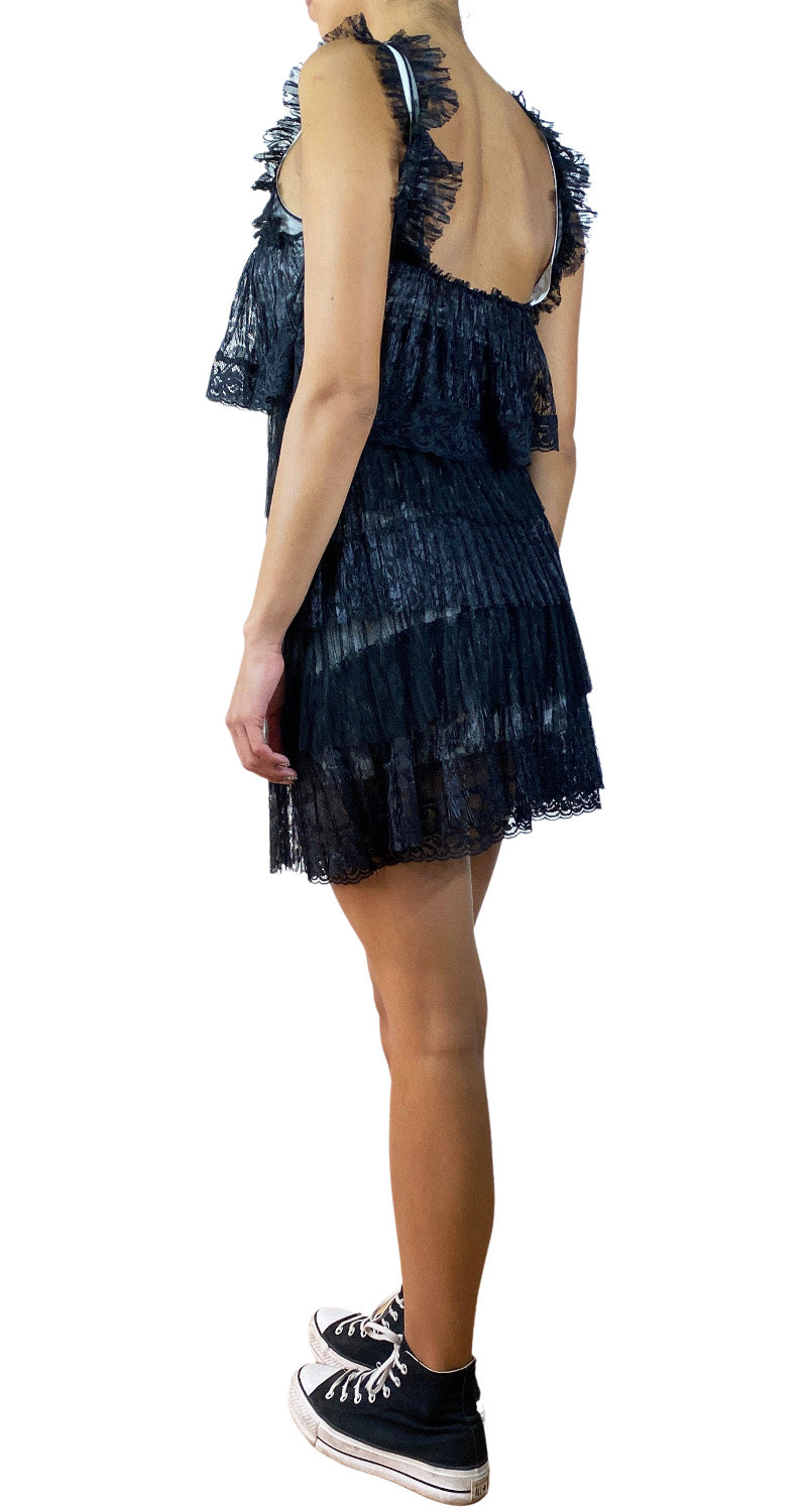 Vestido color Negro con vuelos en Tul y Encajes, fondo Blanco. Altura de modelo 1,68