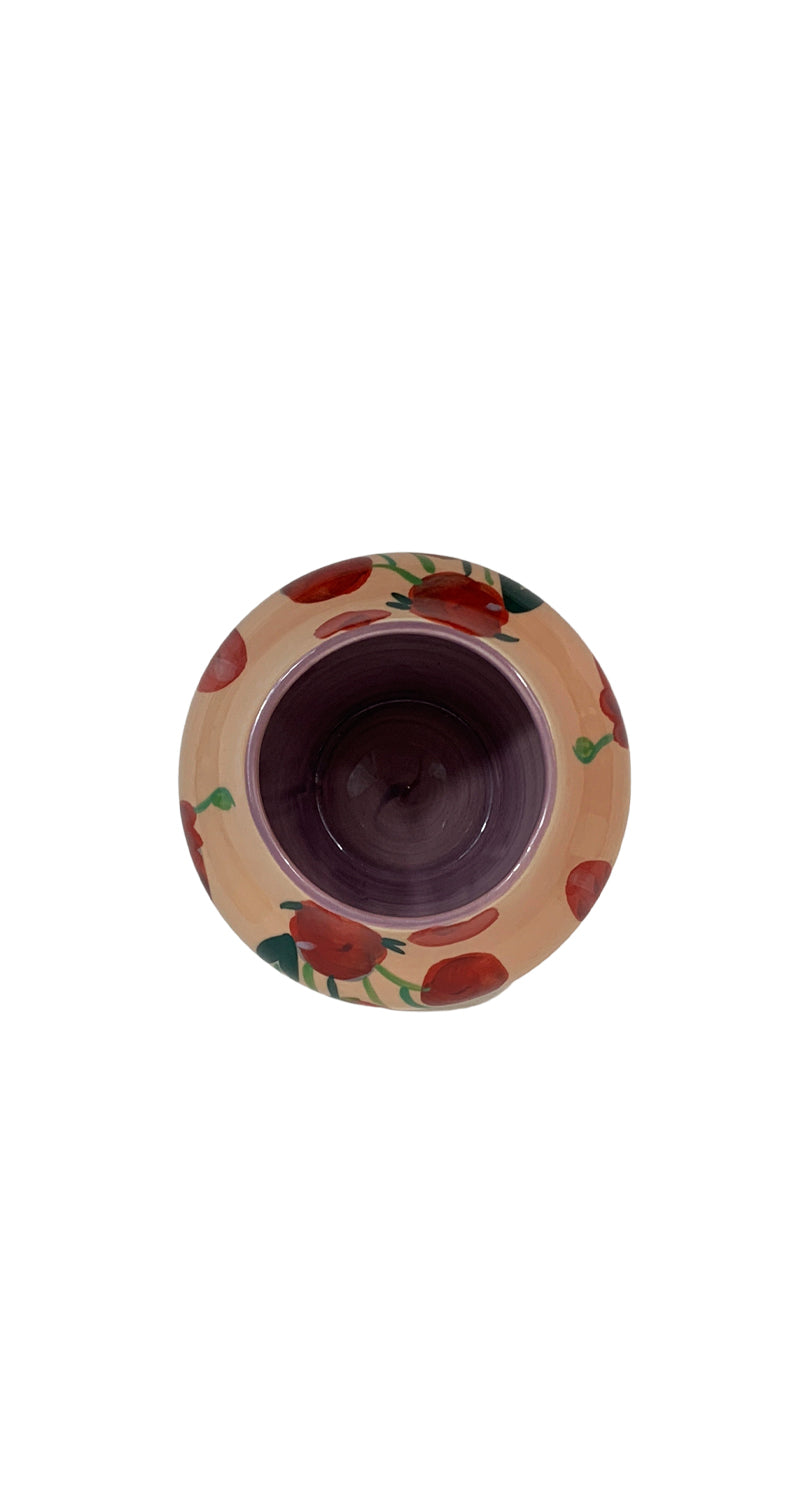 Florero Rosado con flores Rojas. Dimensiones: 11cm de alto y 9cm de circunferencia.