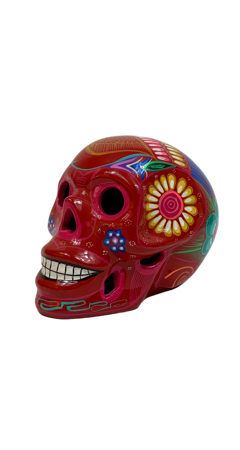 Calavera mexicana con detalles multicolor. Dimensiones: 15cm x 19cm x 13cm.