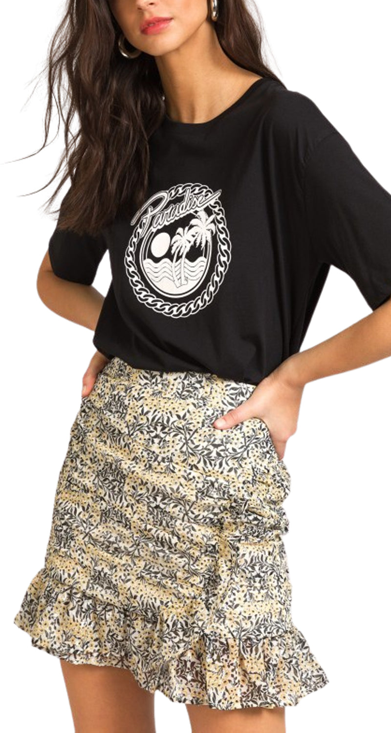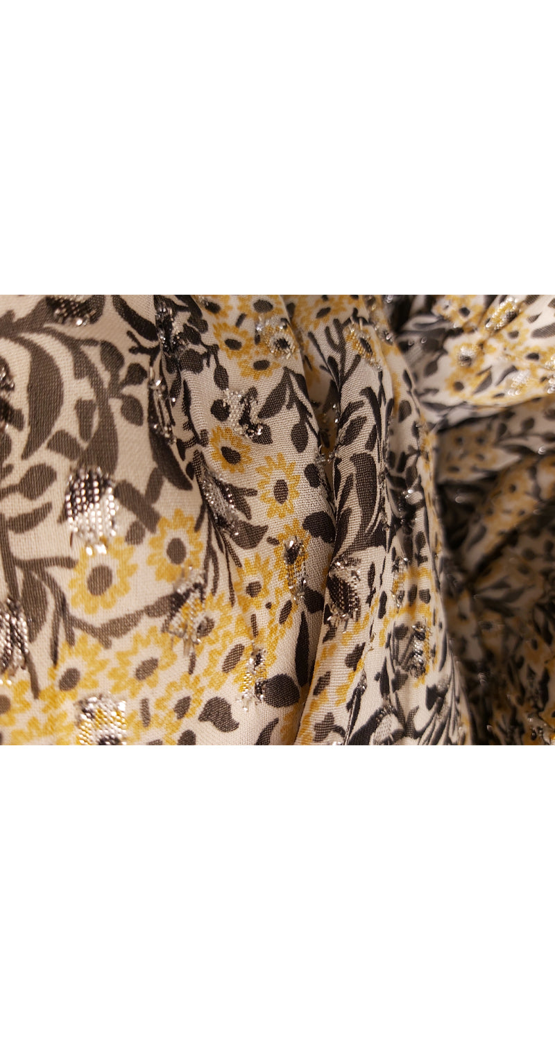 Mini Falda con fruncido en costado y vuelos en ruedo. Estampado floral en tonos Negro, Amarillo y fibras metálizadas.
