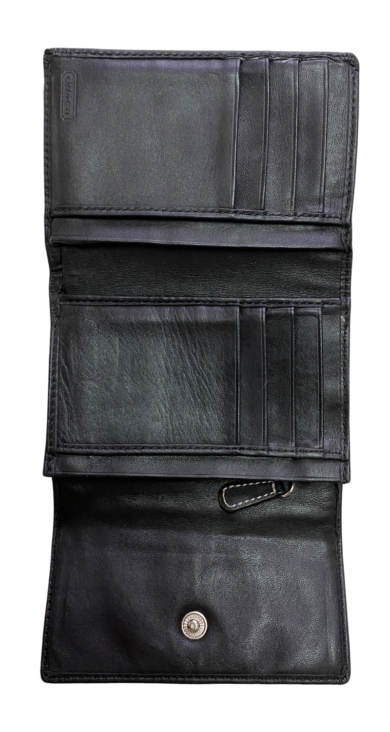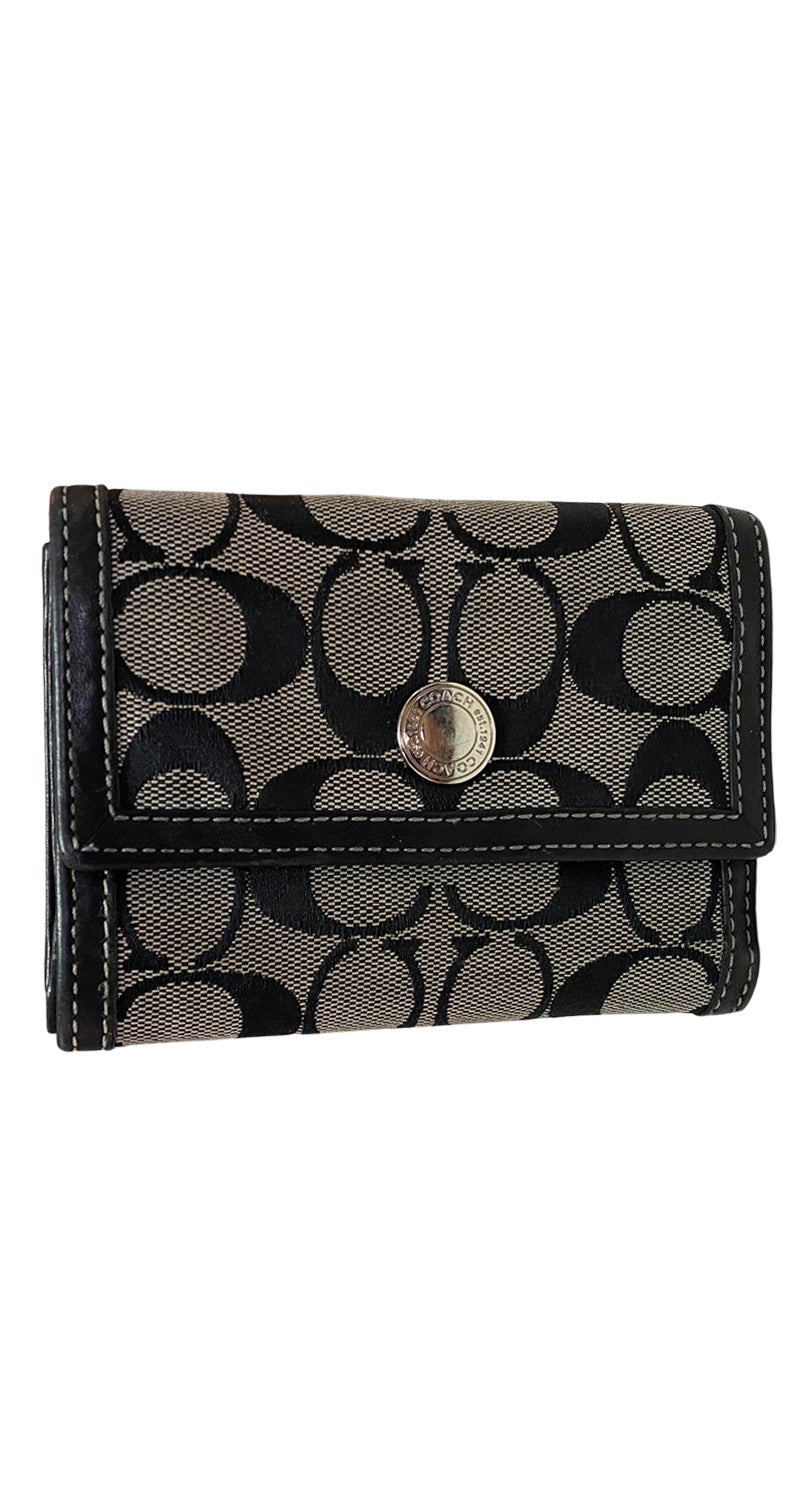 Billetera color Gris con diseño de letras propias de la marca, broche en medio para cierre y múltiples compartimientos internos.