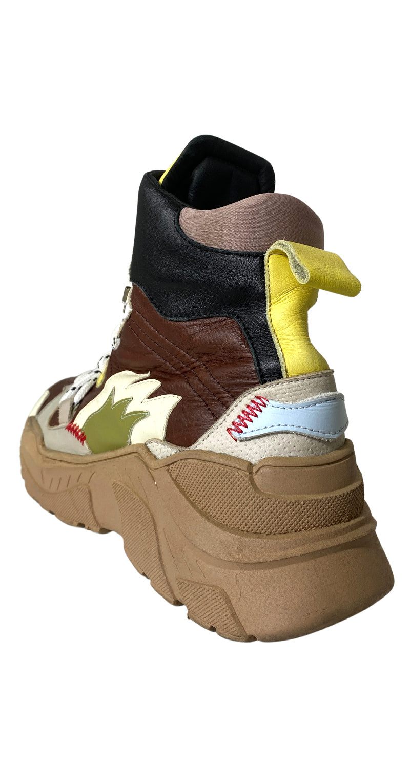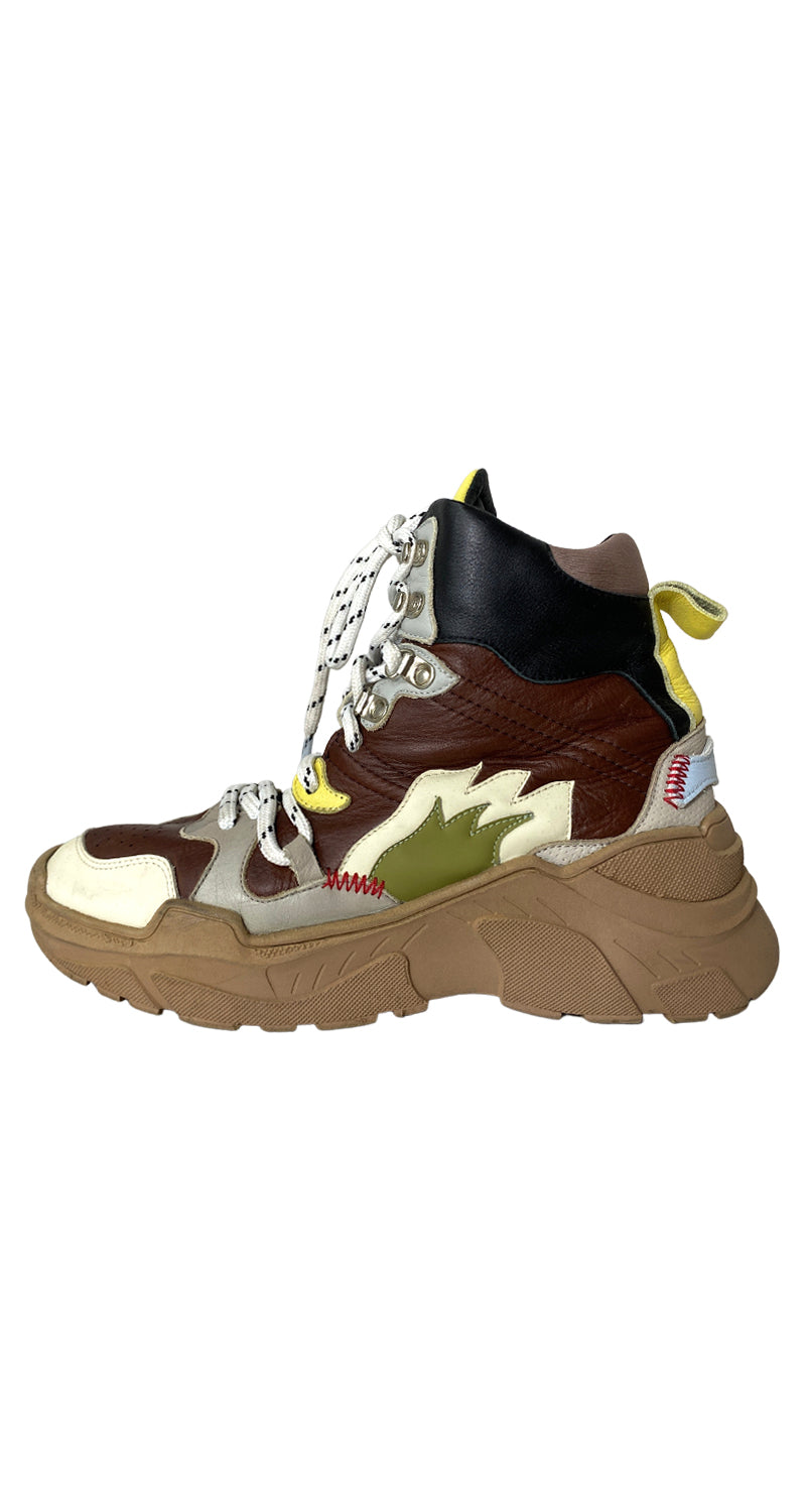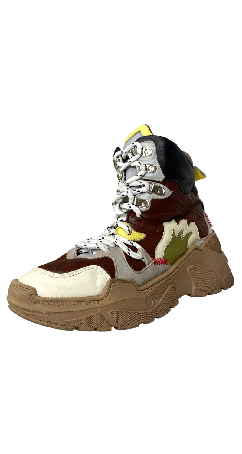 Zapatillas de cuero en Multicolor, suela color Café y cordones Blanco y Negro. Presentan signos de uso. Las compras efectuadas de la categoría calzado, no tienen derecho a cambios ni devoluciones.