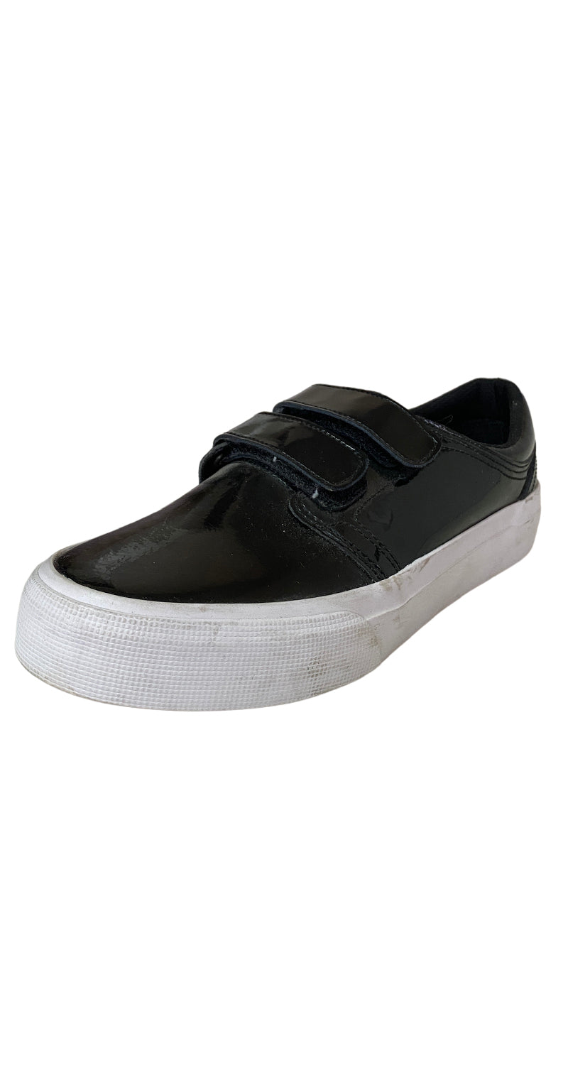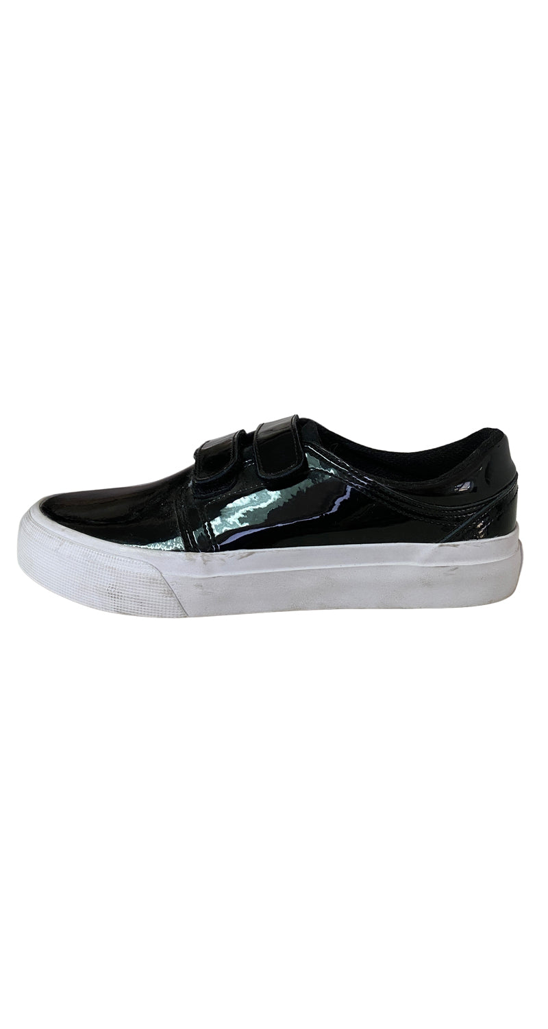 Zapatillas color Negro de charol con velcro y suela blanca.