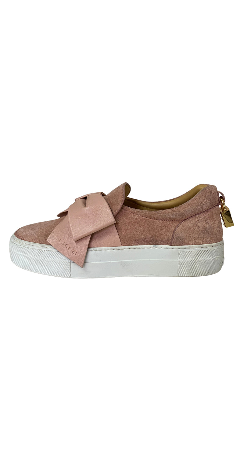 Zapatillas de Velvet color Rosado con lazo frontal, suela blanca y candado Dorado en talón.