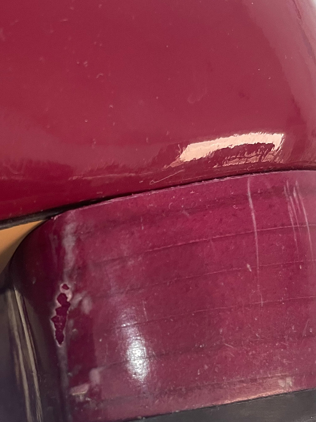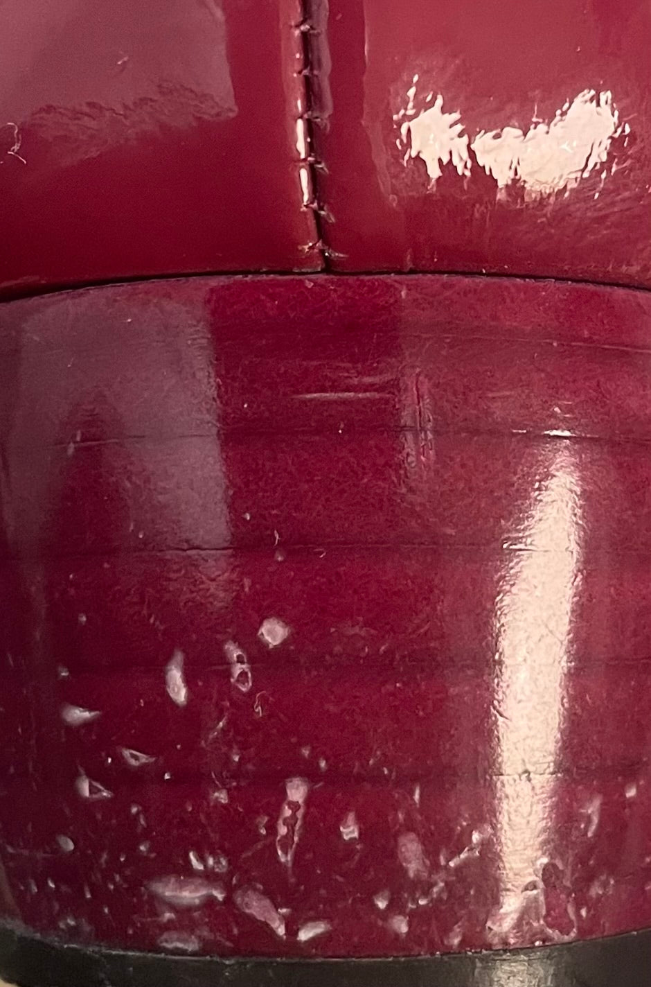 Zapatos de charol en color Morado, lazo en delantero con aplicación Dorada, taco de 3 cm de alto. Talla 7,5 de la marca. Presentan signos de uso. Las compras efectuadas de la categoría calzado, no tienen derecho a cambios ni devoluciones.
