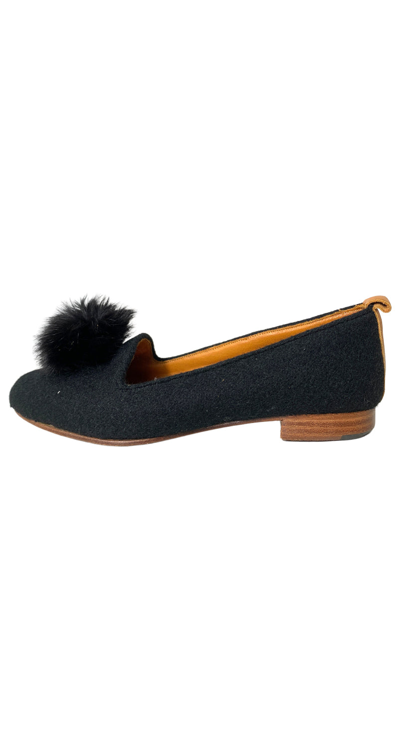 Zapatos con textura de fieltro en color Negro y pompón en punta. Las compras efectuadas de la categoría calzado, no tienen derecho a cambios ni devoluciones.